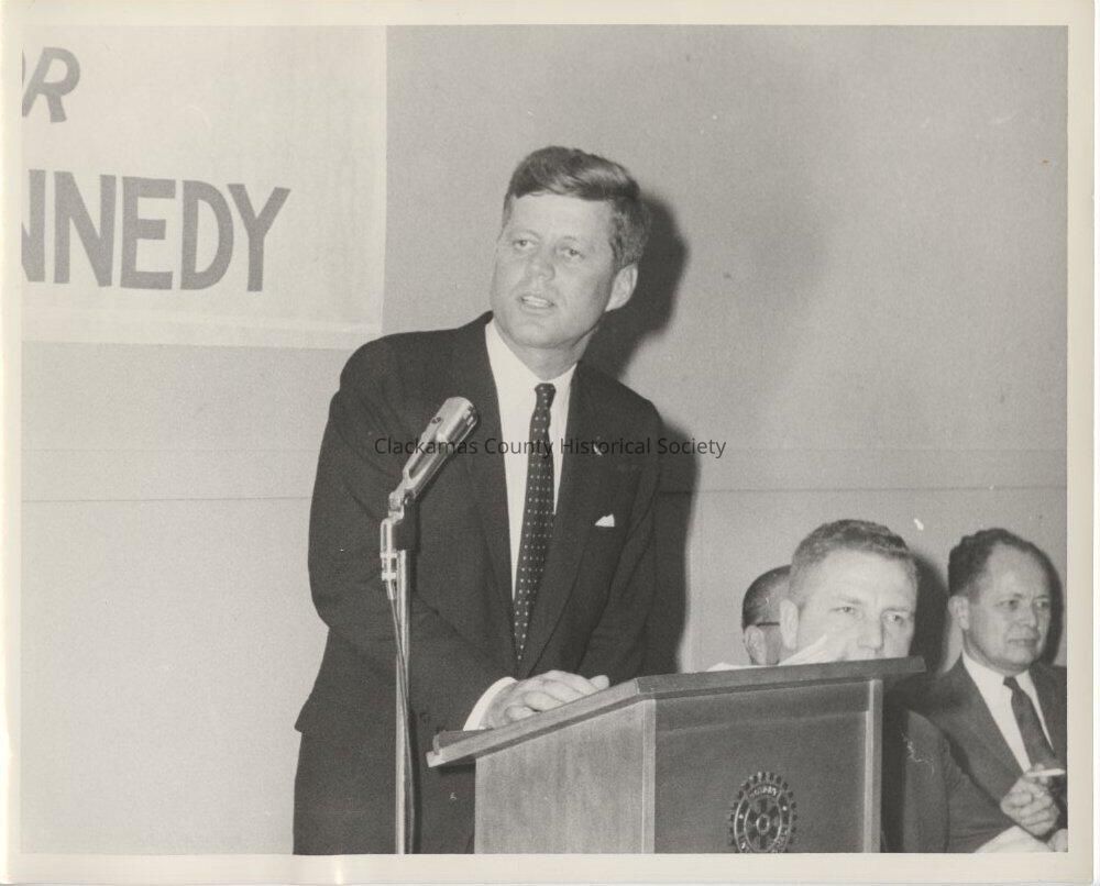 JFK at a podium giving a speech at a Clackamas County Banquet. Senator John F. Kennedy on political tour of Clackamas County, while running for President of USA.