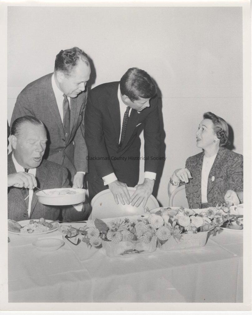 JFK, leaning on a chair, is talking to a lady at Clackamas County Banquet. The man seated to his right is dishing out food onto his plate, while another man is standing next to JFK.Made/Created