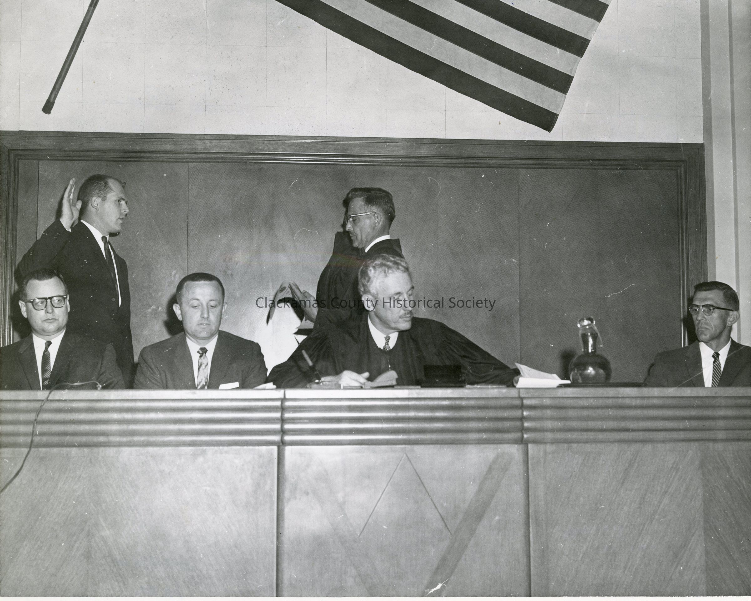 Judge being sworn in by Judge Phil Hammond. Sitting left to right: Unknown, Judge Howard Blanding, Ralph Holman, and Win Bradshaw.Made/Created