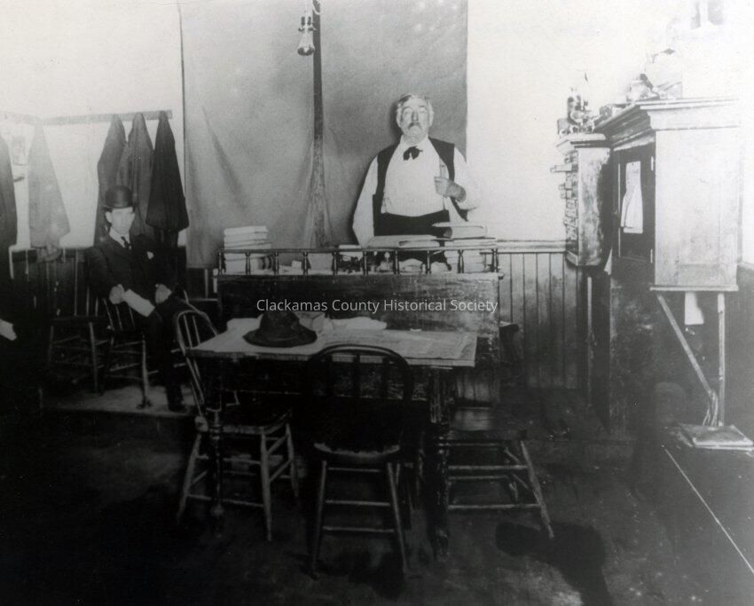 Justice Court, Judge Sampson. 1911. Interior or court room. 7141/2 Main Street. Unidentified person.Made/Created
