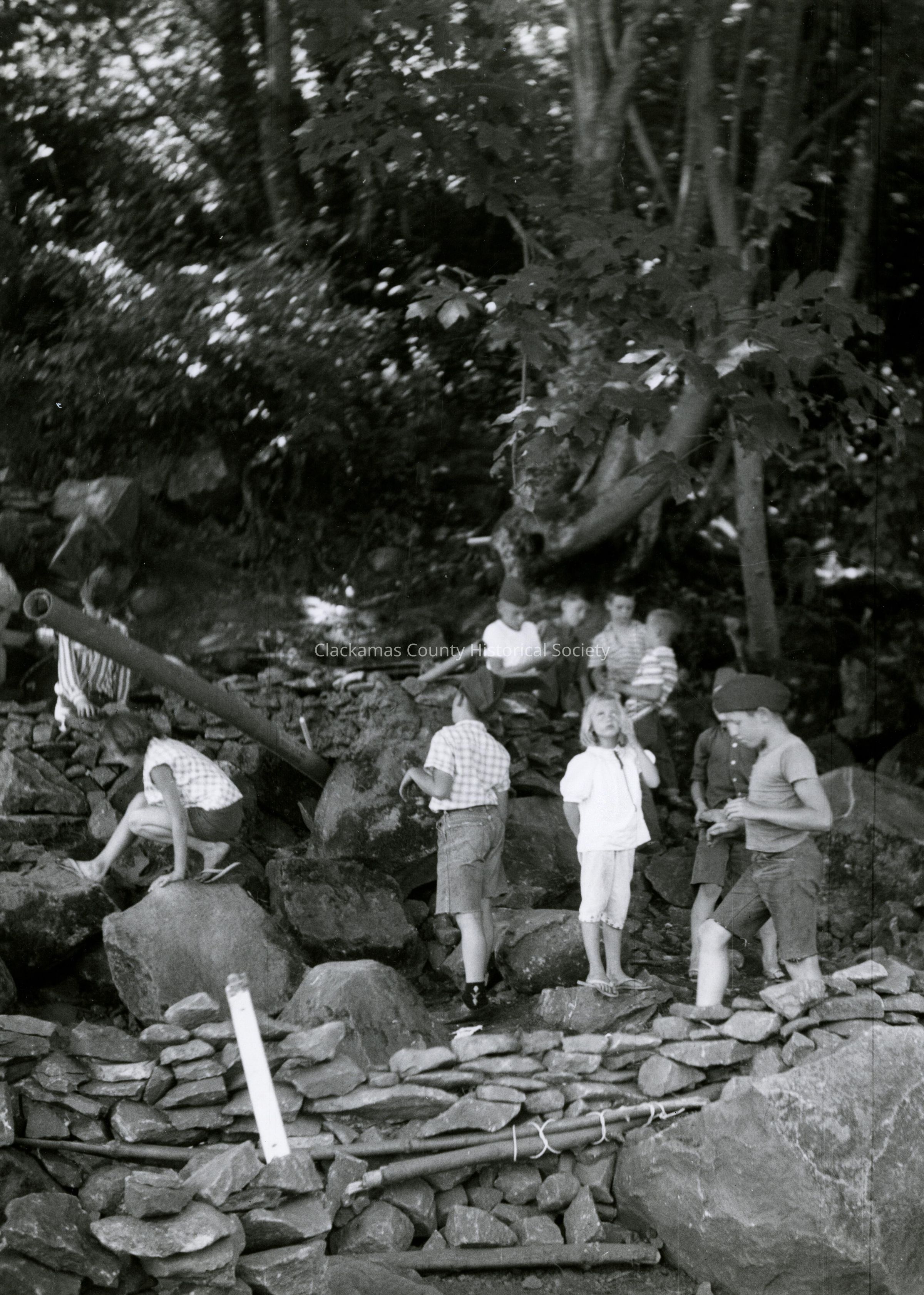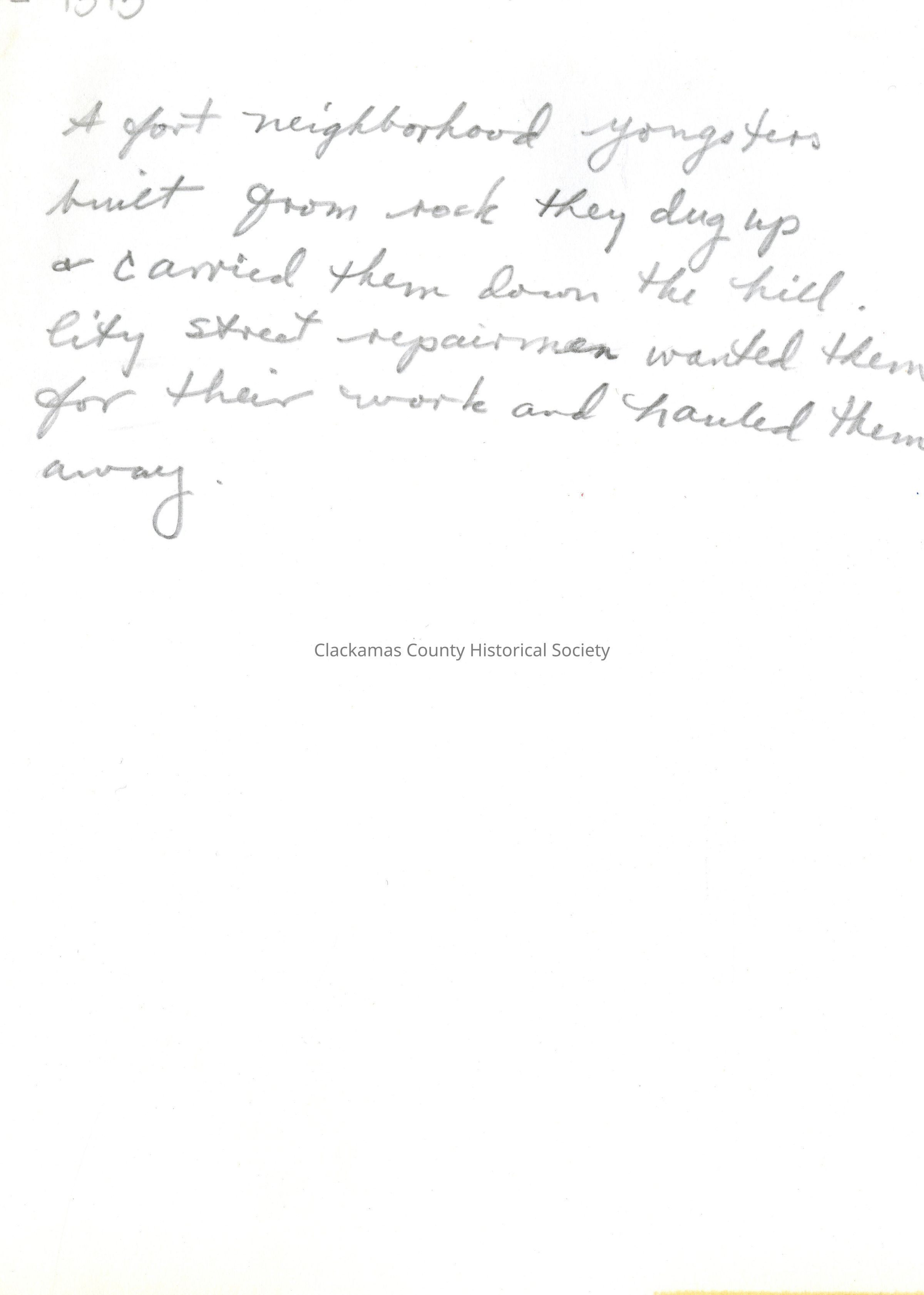 Back of Photo: A fort neighborhood youngsters built from rock they dug up and carried them down the hill. City Street repairmen wanted them for their work and hauled them away.