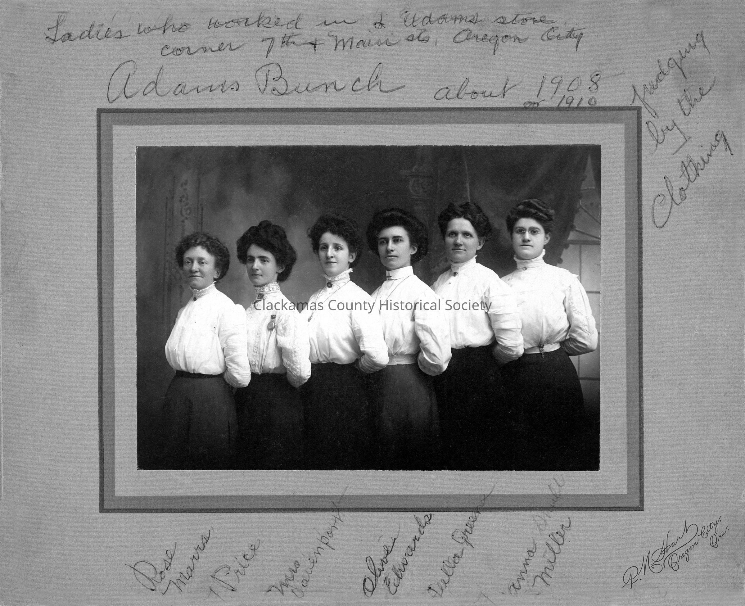 Lady Workers of the Adams Store, corner of 7th and Main Streets in Oregon City. From (L-R): 1) Rose Marrs; 2) F. Price; 3) Mrs. Davenport; 4) Olive Edwards; 5) Della Green; and 6) Anna Miller.Made/Created