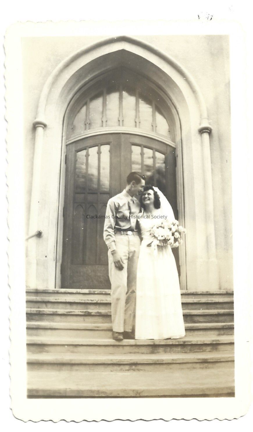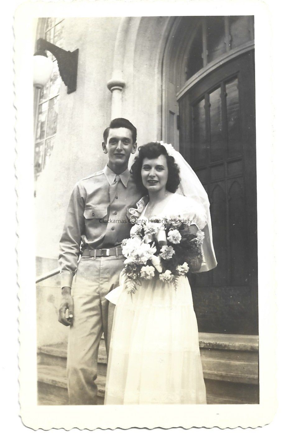 Enclosures of 2 wedding pictures of Betty and Bob (Robert R. Rice). Robert in Military uniform.