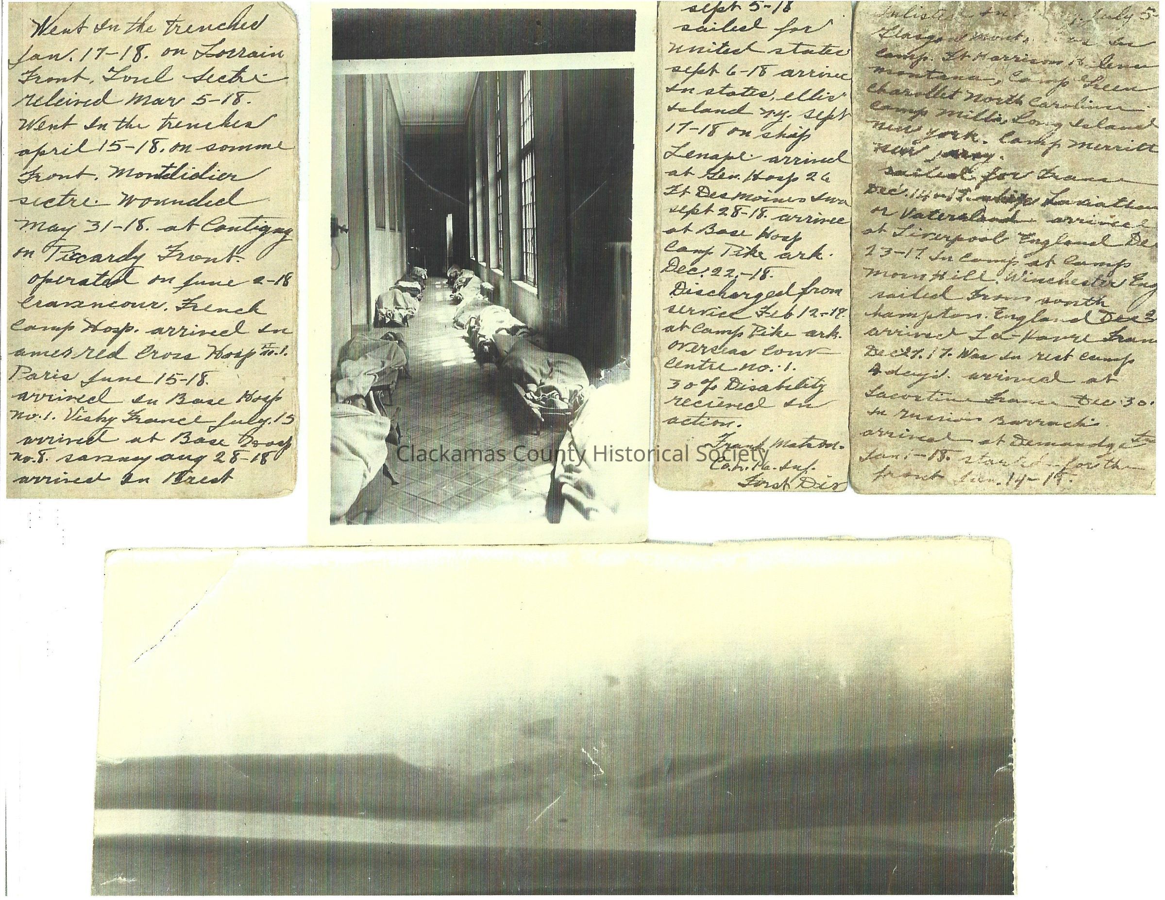 Photocopy of a letter with enclosed photographs. From the front lines in France during World War I. One photograph shows two lines of possibly hospital cots occupied with what appears to be patients.