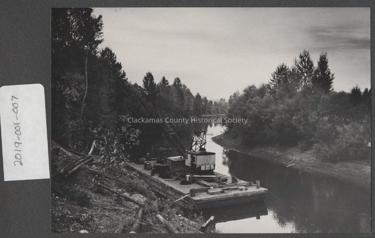 Logging Scene of a barge with crane working logs on River bank - No Date or Location