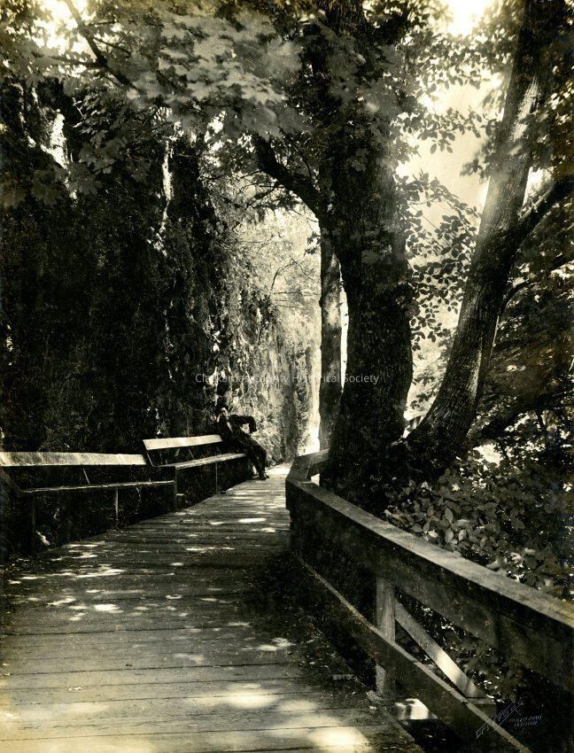 Lover's Lane, Oregon City. Man on bench. Wood plank trail.Made/Created