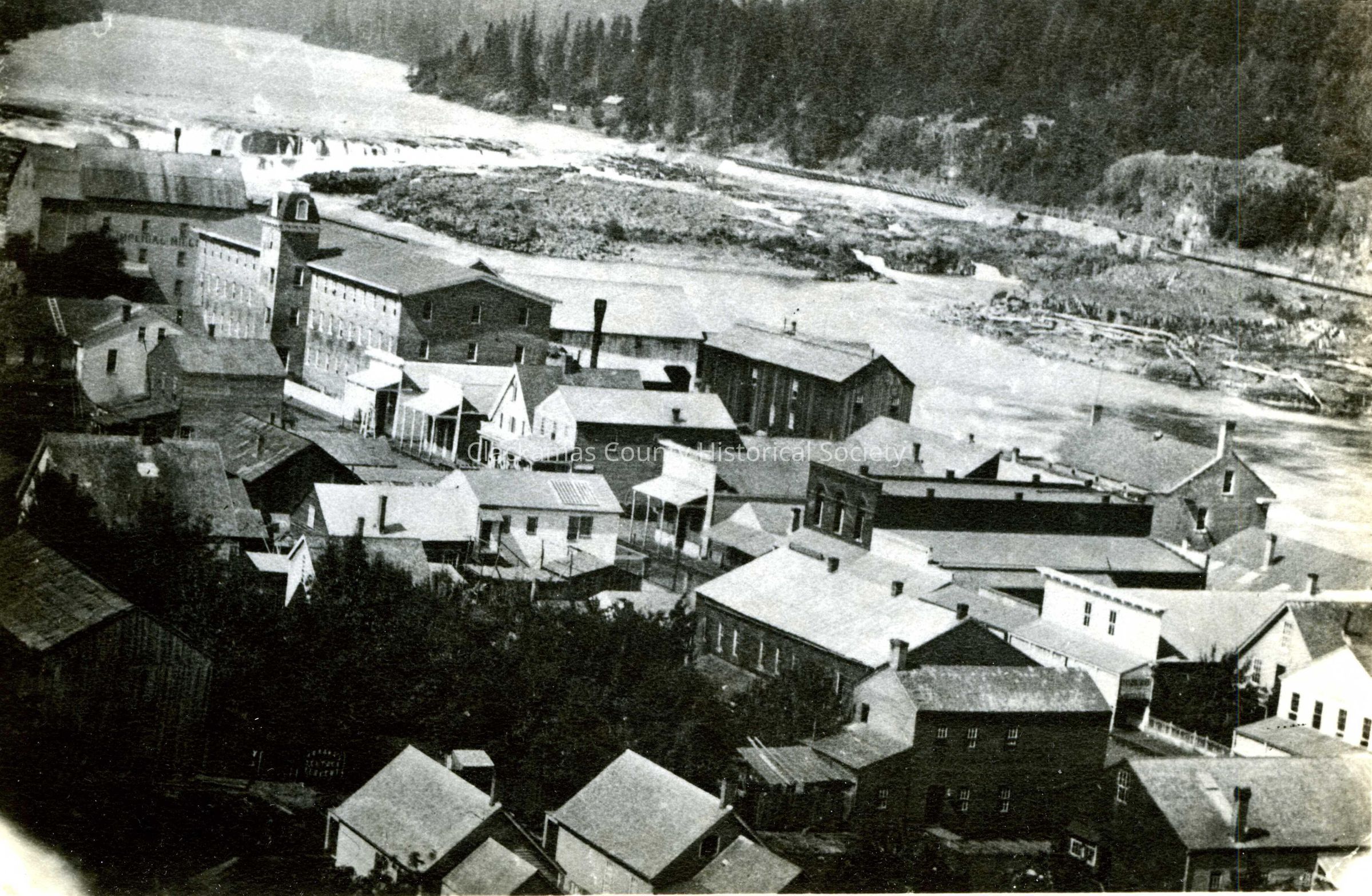 As viewed from the Oregon City Bluff, the Willamette Falls and West Linn Locks area prior to the building of the West Linn mills.Made/Created