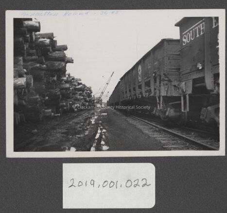 logs stacked along rail tracks and train