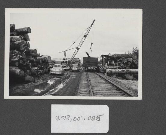 Crane in log yard and car parked by the logs