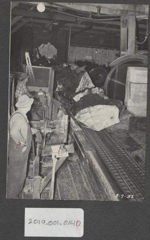 two men watching log bring cut saw mill 1952