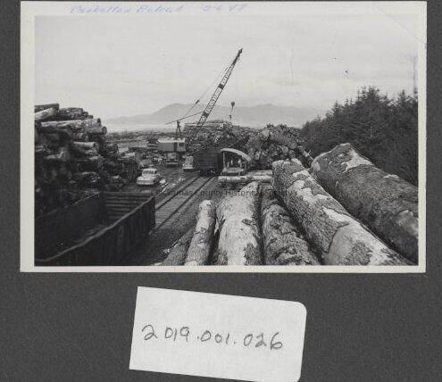 Crane in log yard parked car, truck