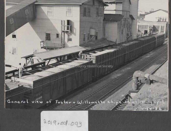 Railcars long the edge of the mill men walking on them Willamette Valley Lumber 1952