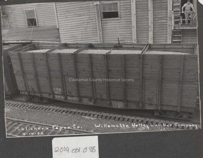 Railcar by a building Pulishers Paper Co/ Willamette Valley lumber company