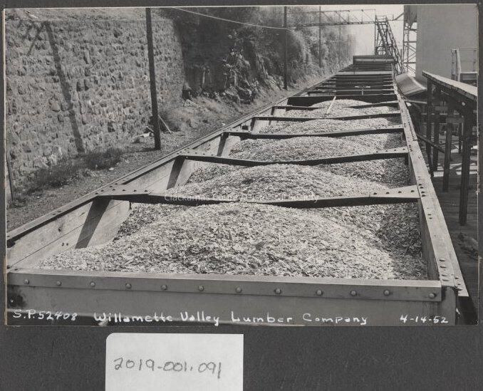 train cars full of wood chips Willamette Valley lumber co. 1952