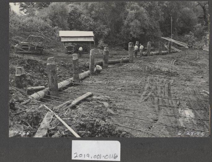 men, dozer, logs in the ground, men working cables long the ground 1952