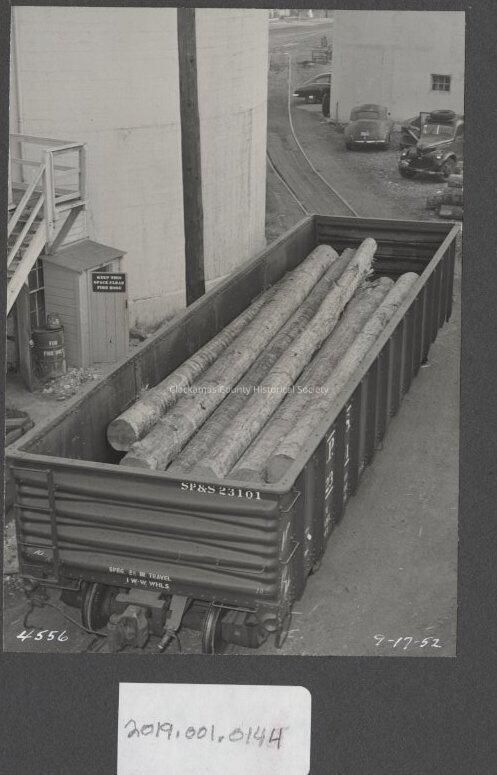 Railcar loaded with logs going into the mill