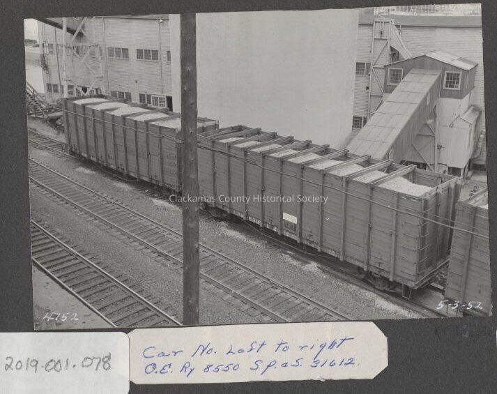 Railcar full of wood chips Car no. left to right OE Ry 8550 Spa s 31612
