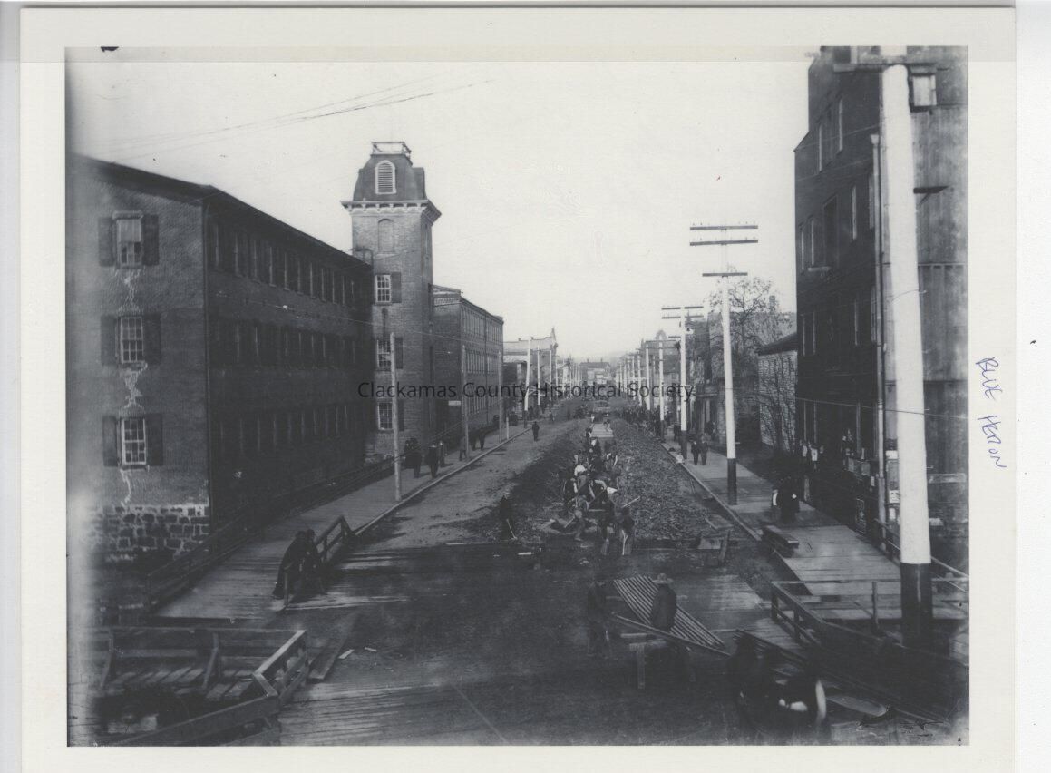Main Street Oregon replacing railroad tracks on Main Street McLoughlin House 2nd building in.