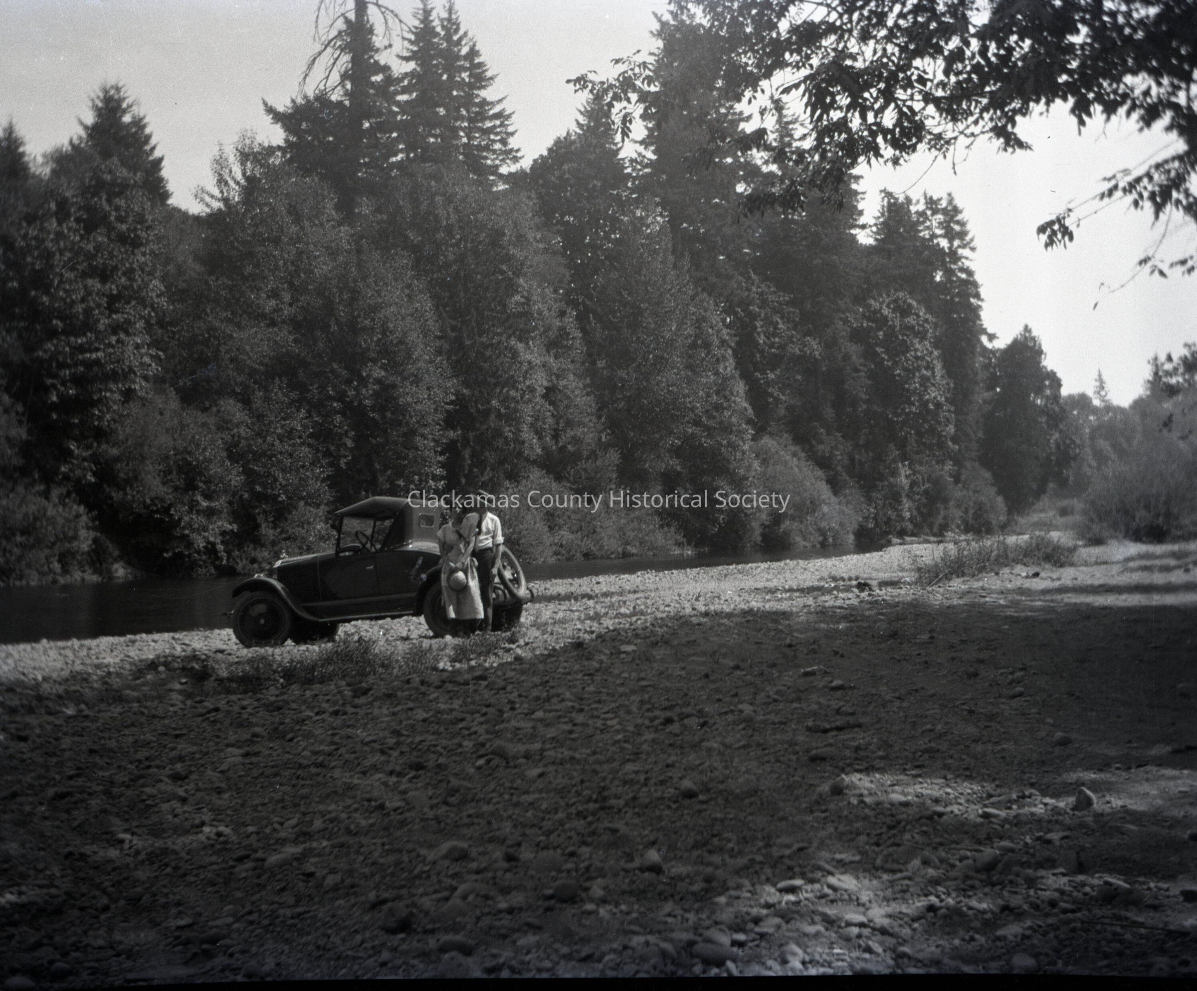 Man and Woman with Car at Riverside.Entry/Object ID