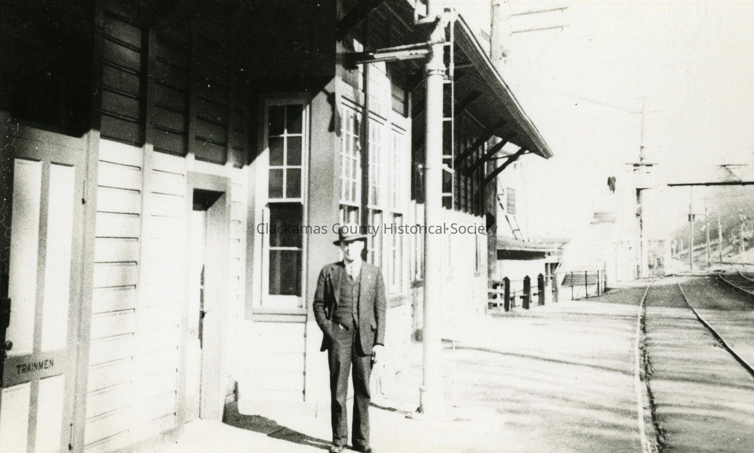 Southern Pacific Depot Oregon City looking North east 1930's man in front of station - Old elevator in background Gift of Quinn