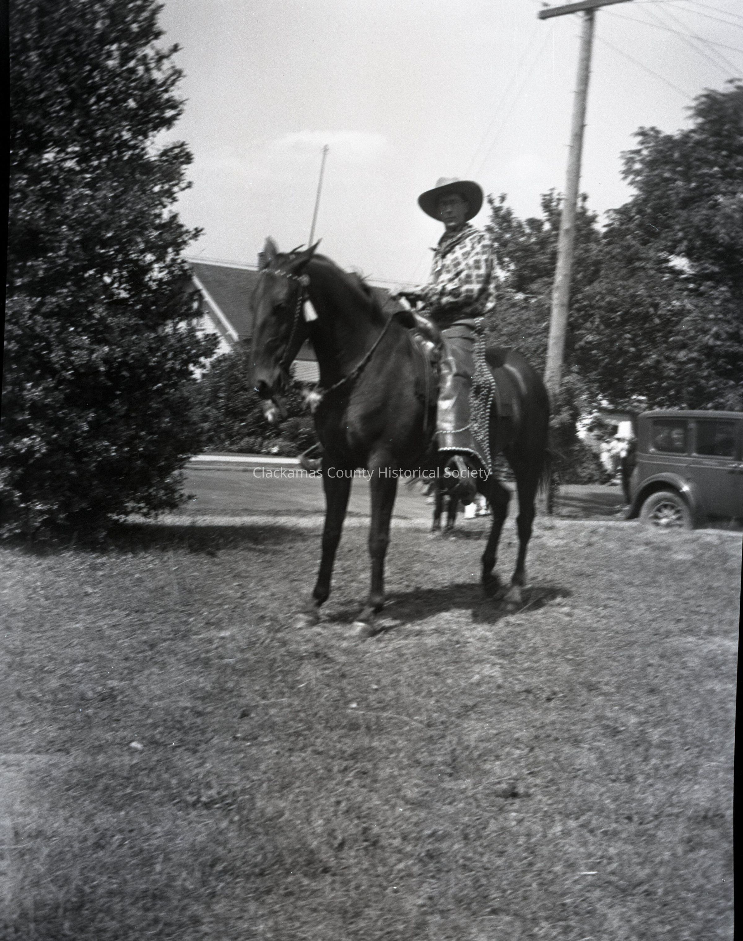 Man in Chaps on Horseback, car and house in background.Made/Created