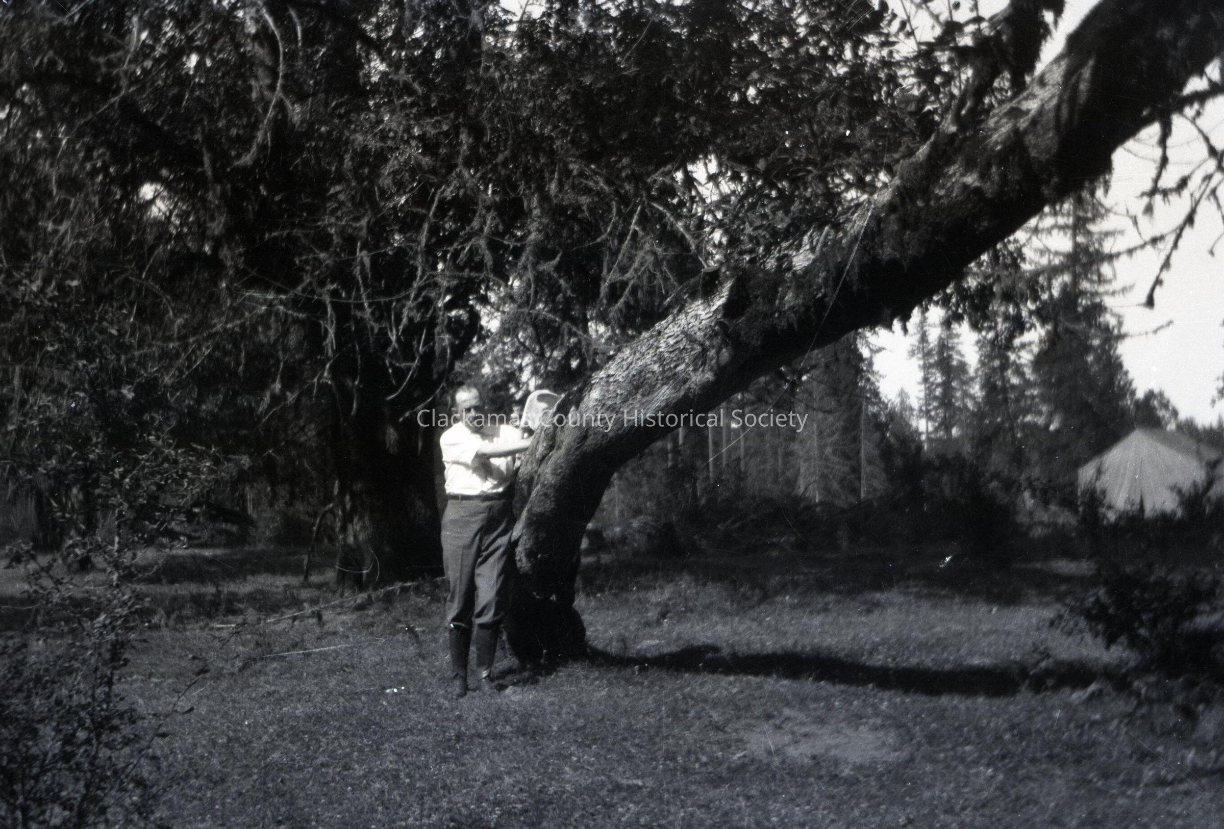 Man leaning against tree. Tent in background. (envelope unmarked).Made/Created