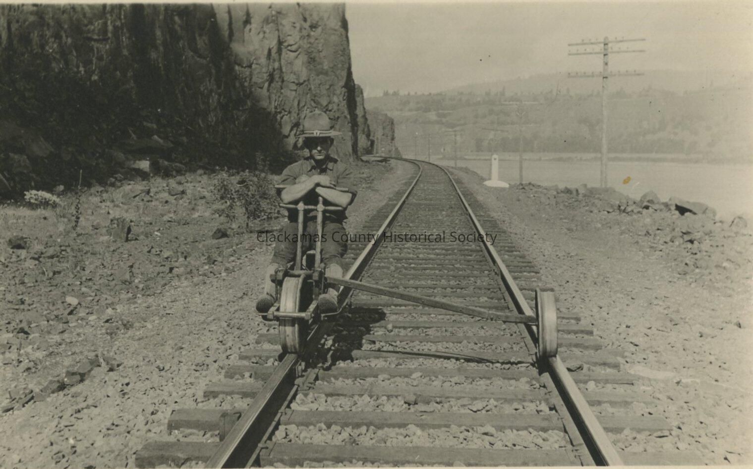 Man on railroad speeder (track maintenance car) opn tracks along river (Willamette?) On back is written: Yours truly on speeder. train tracks railroad railroad speeder portrait