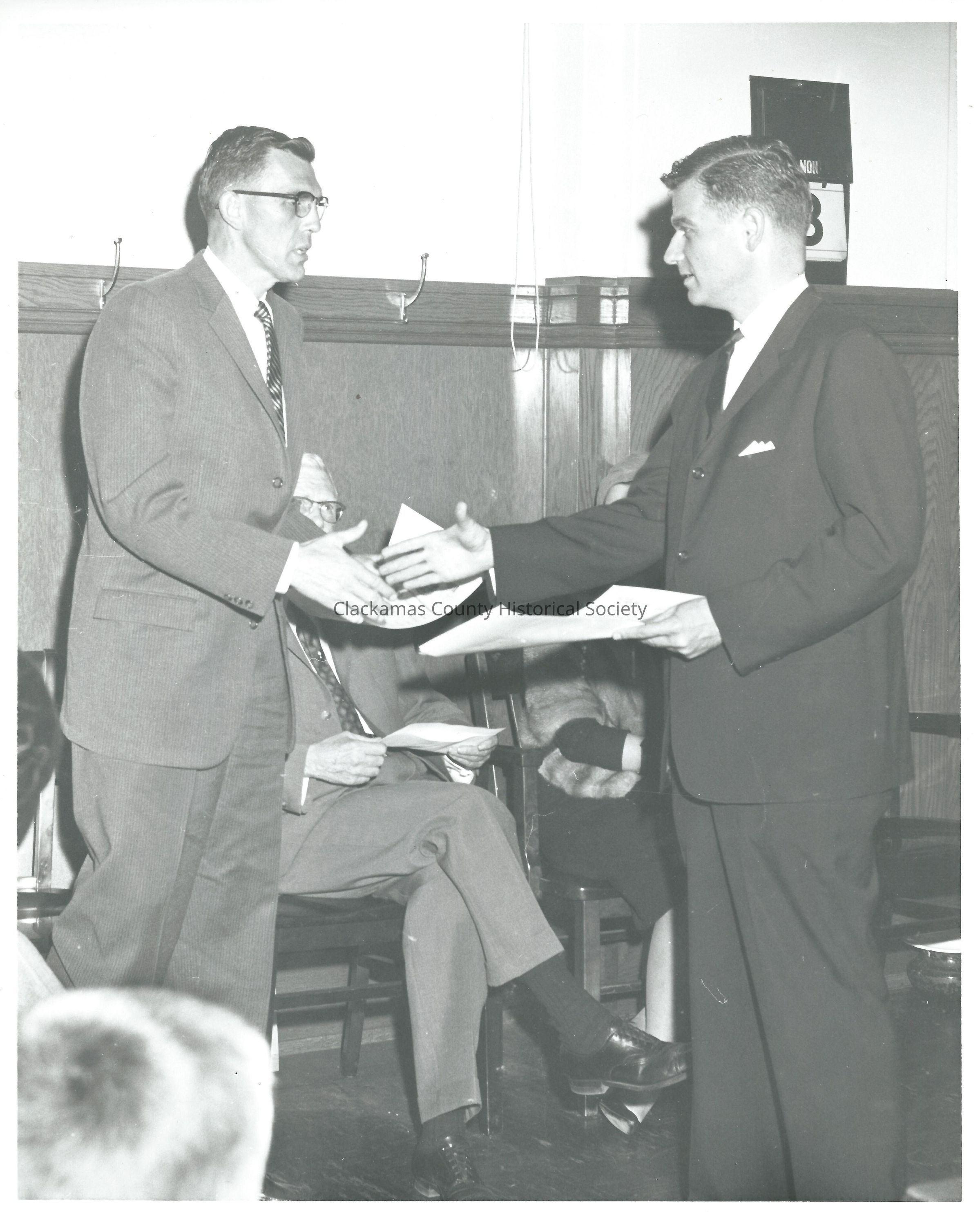 Mark Hatfield (right) shaking hands with Judge Winston Bradshaw - 1950'sMade/Created