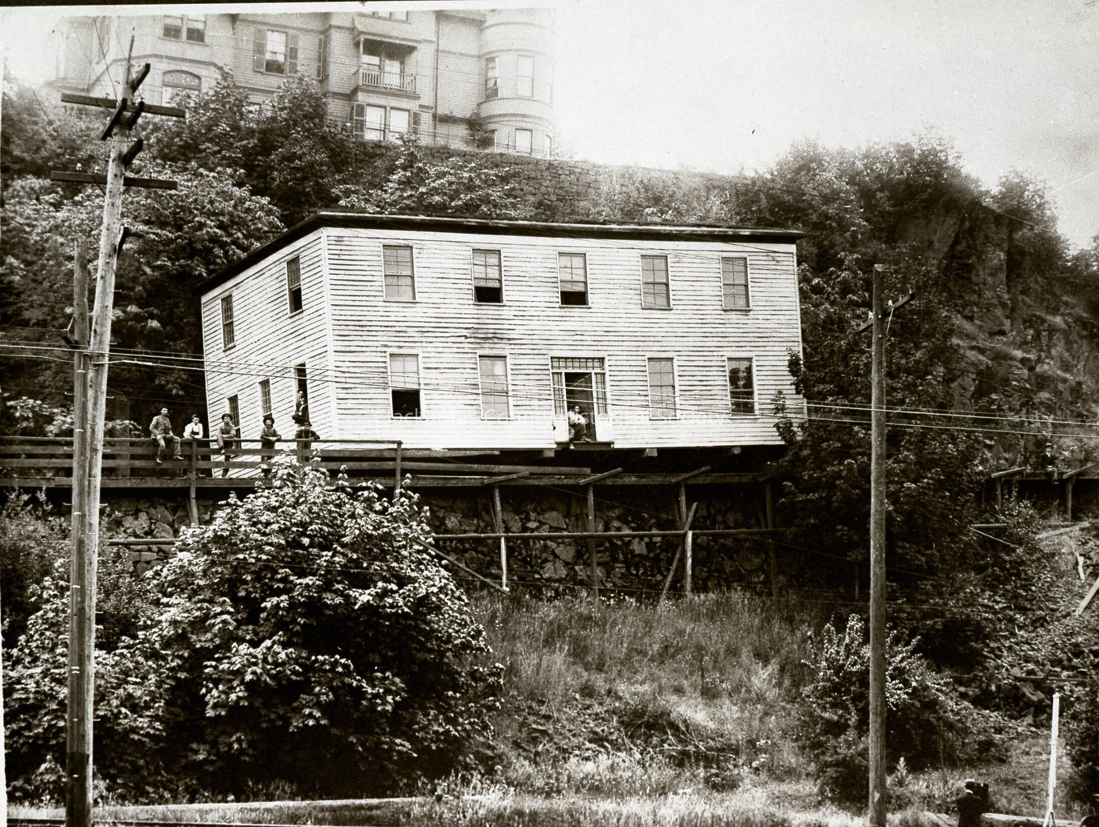McLoughlin House, as it is moved up Singer Hill. The view is from 9th Street, looking up.Made/Created