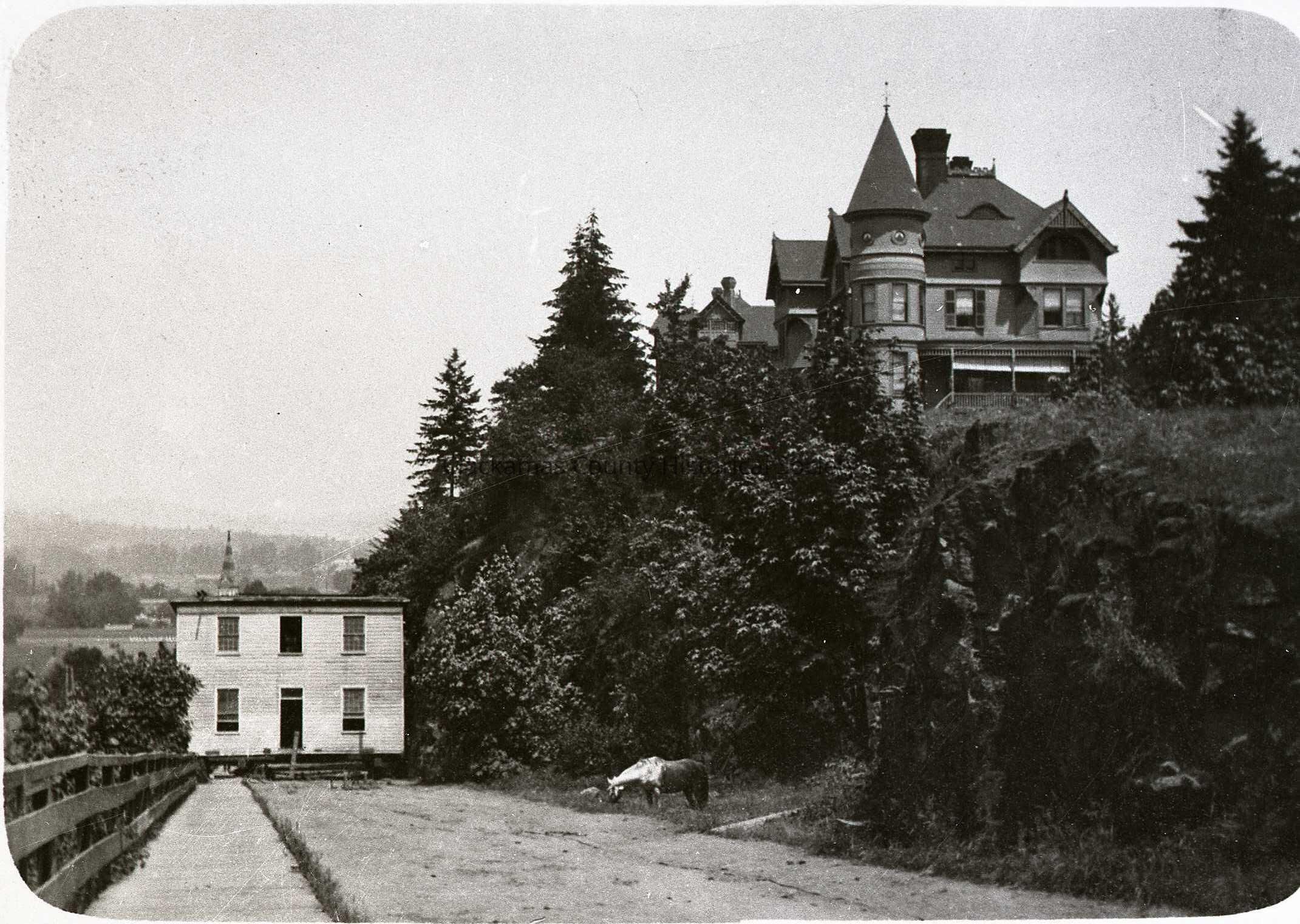 McLoughlin House, as it is moved to new location on the hill. View is looking down Singer Hill. Eastham House, later Caufield Home in background.Made/Created