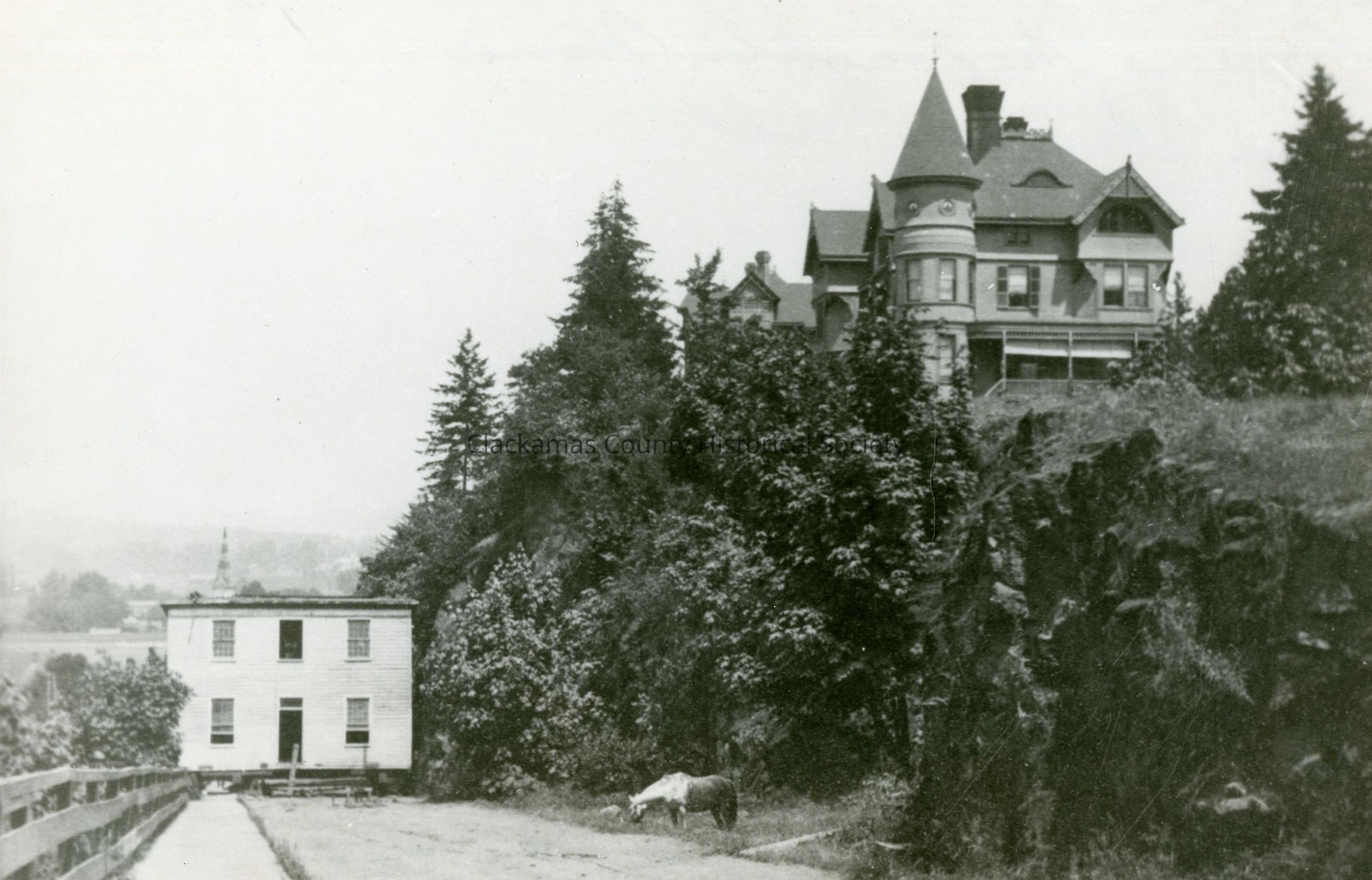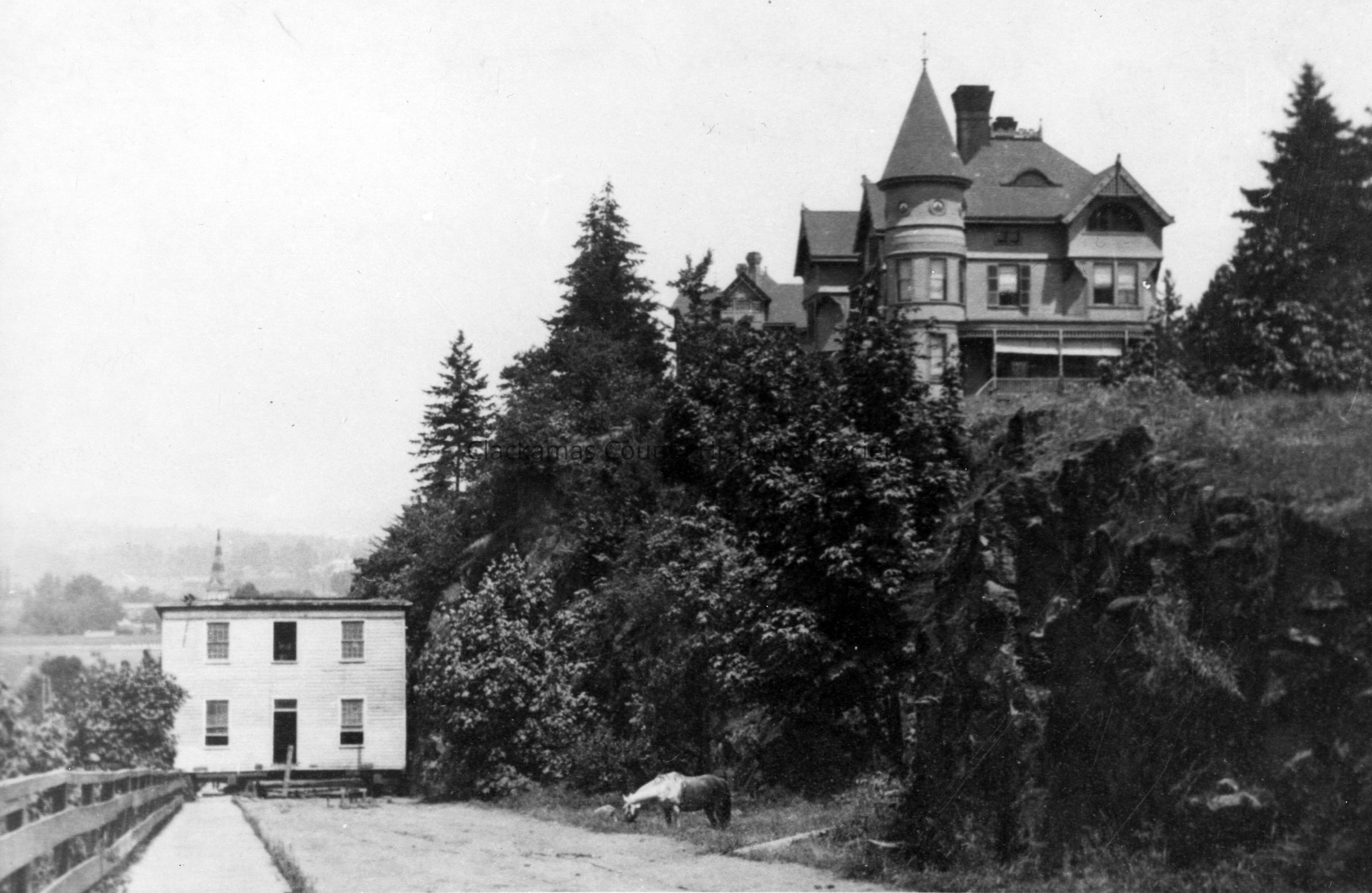 McLoughlin House being moved up Singer Hill, 1909. Eastham house in background.Made/Created