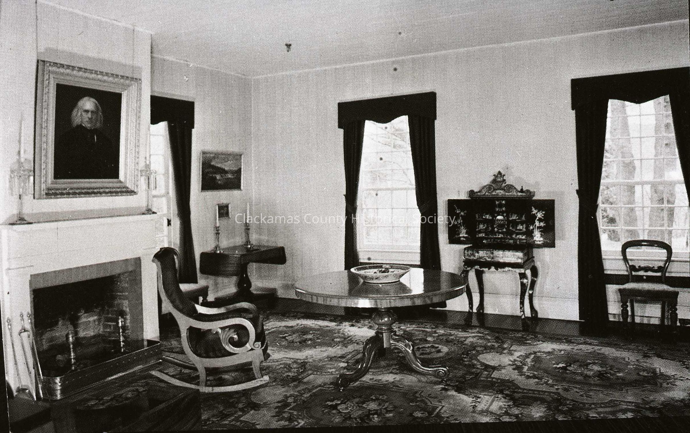McLoughlin House downstairs parlor, showing fireplace. Copy from Color Post Card 11933 of McLoughlin House.Made/Created