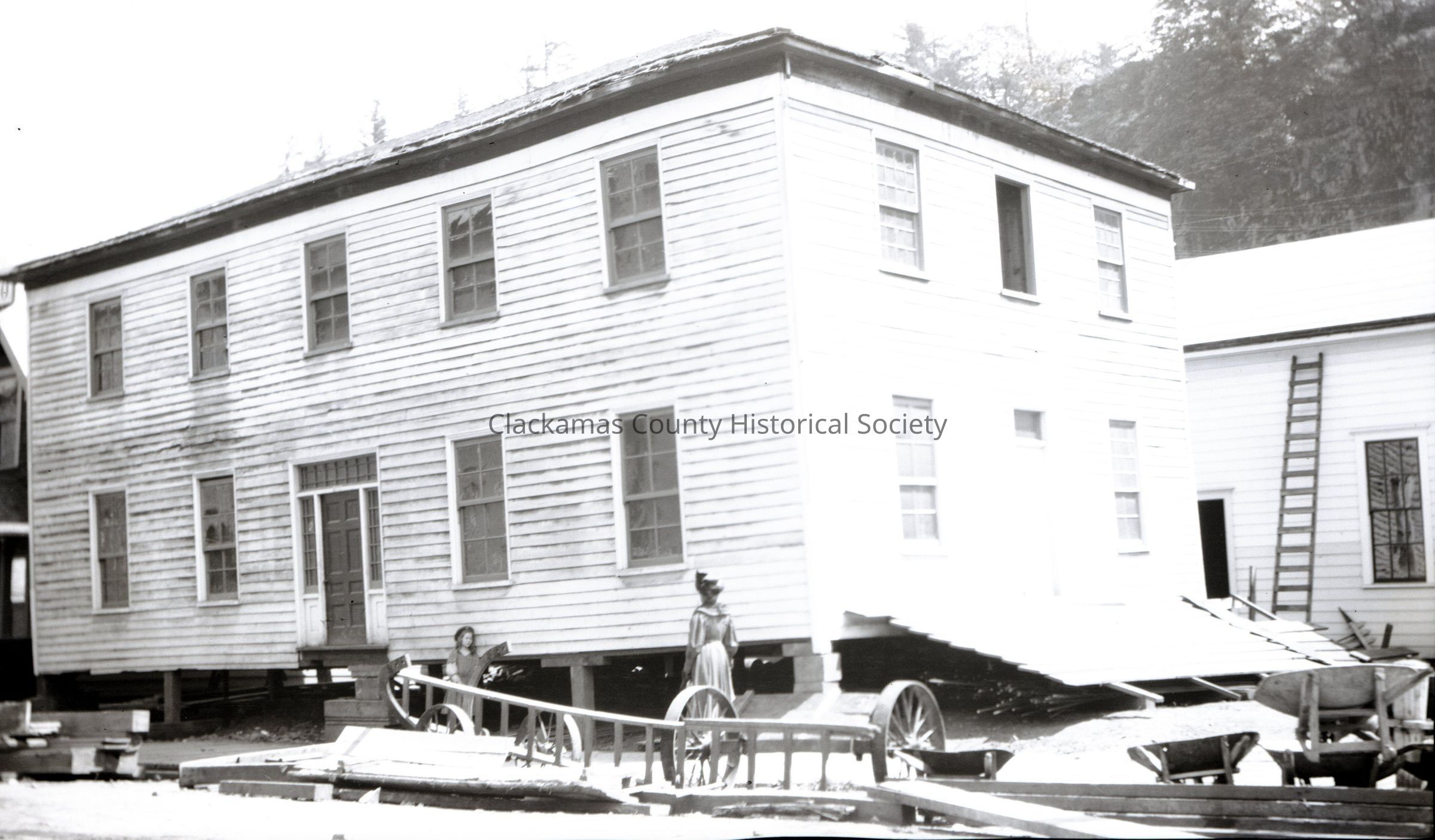 McLoughlin House ready to be moved. Mrs. H.C. Erving and daughter, Francis are in the photo.Made/Created