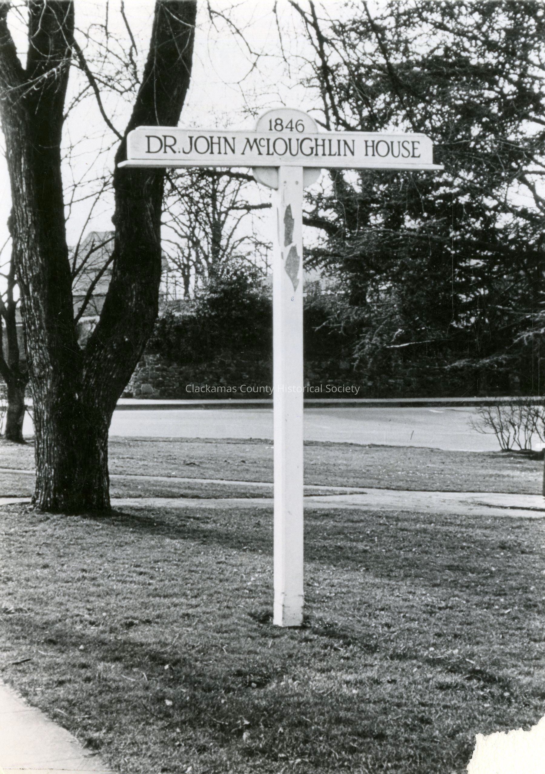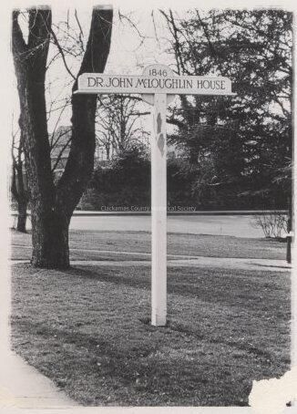 Corner of McLoughlin Park. On back: "Here's when Dr. M acquired land. Corner of McLoughlin Park donated to Ore. City by Dr. McLoughlin in 1850. Slide 3" Sign marking location.