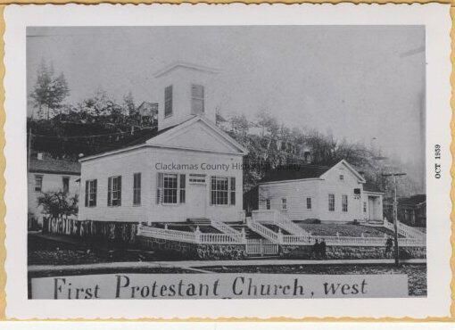 The Oregon City ME Church as pictured in 1885. This was the First Protestant Church.