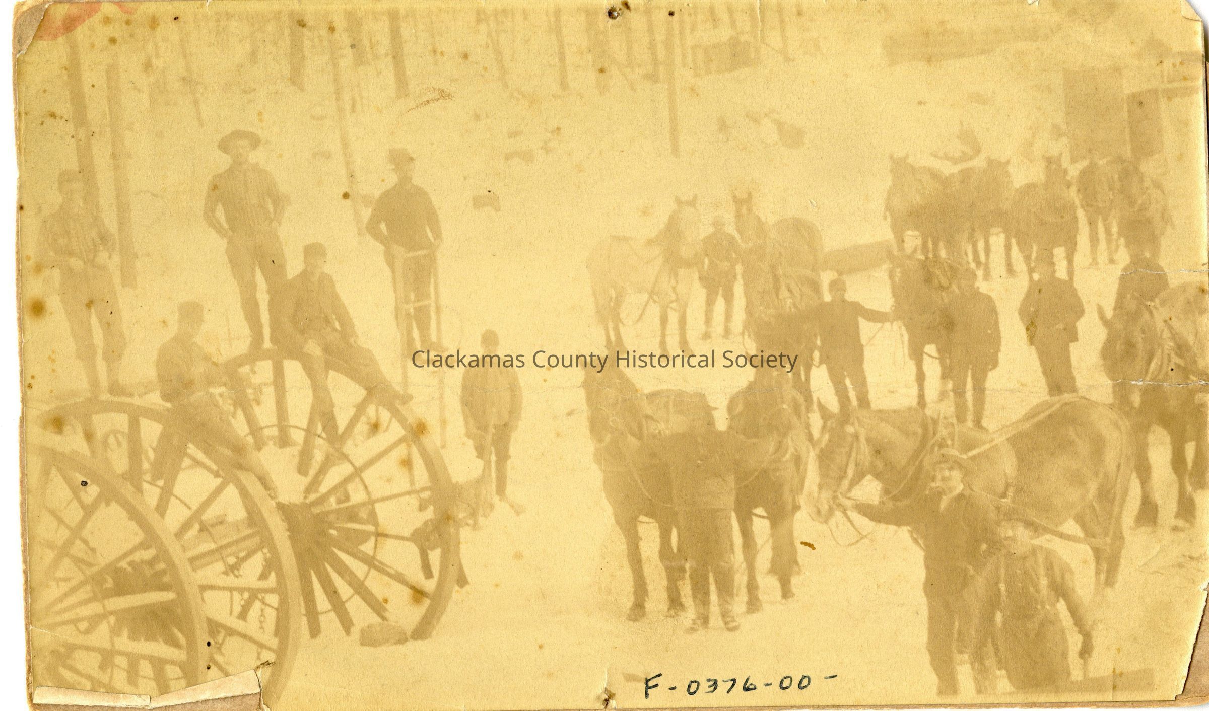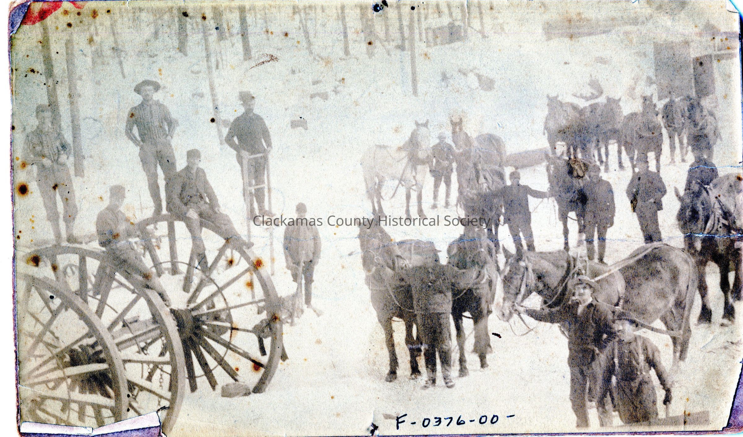 Multiple unidentified men waiting to harness horses to a large wheeled vehicle. Snow appears to be on the groundOther Names and Numbers