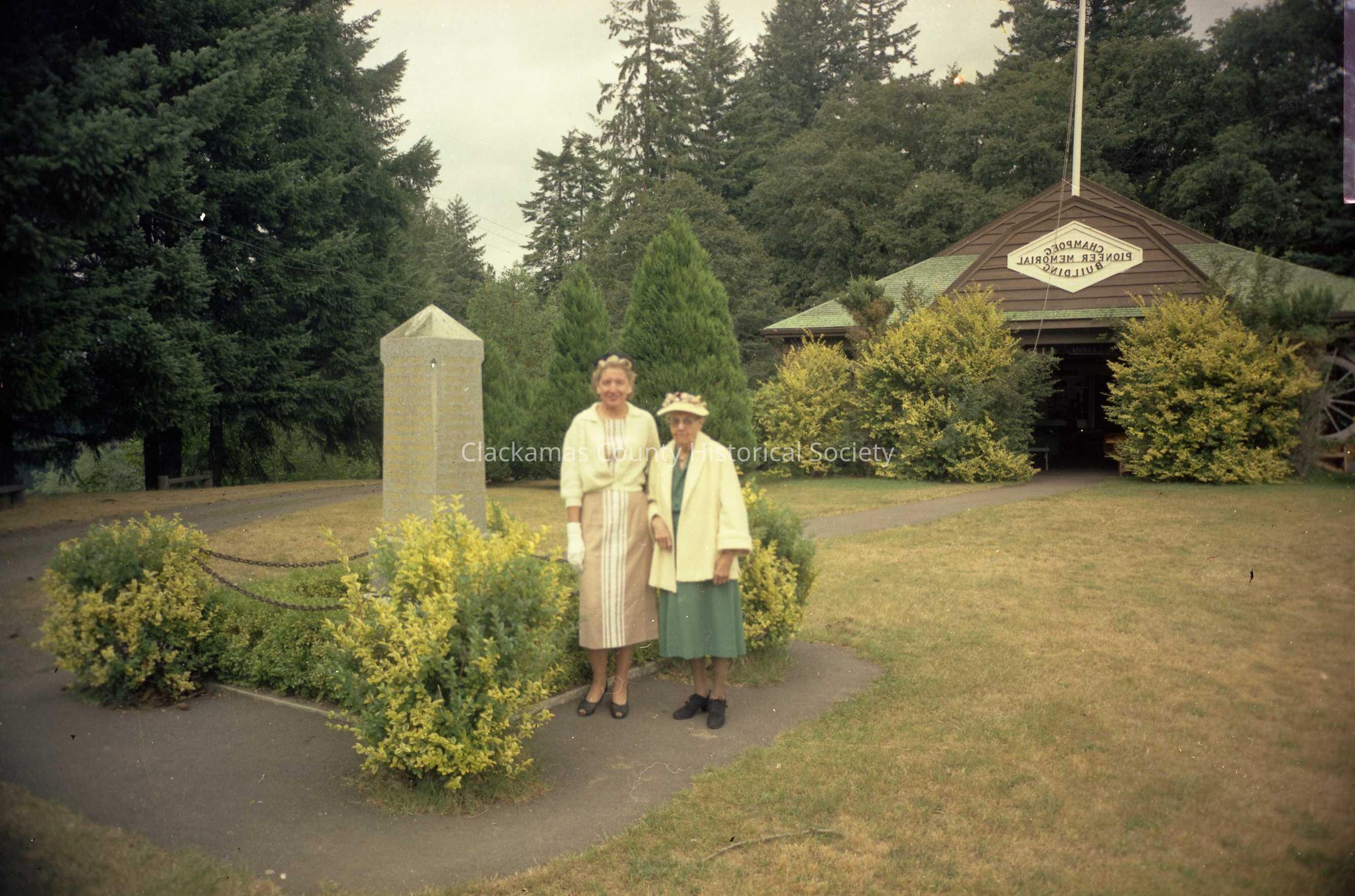 Mertie Stevens and Gertrude Brumbagh at Champoeg Memorial Marker.Made/Created