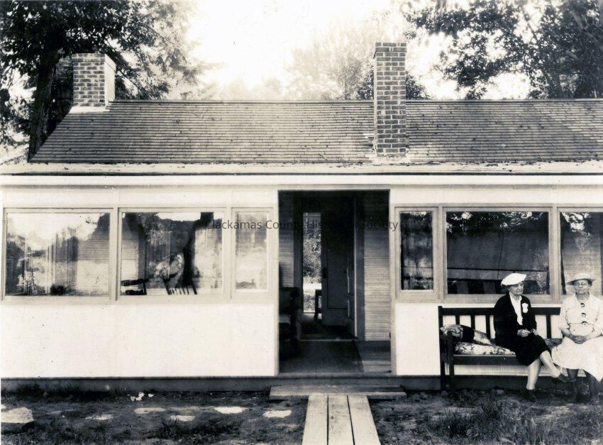 Mertie Stevens' River House in West Linn. Mertie Stevens is seated to the far right on the bench. with her Aunt Etta is on the left (JAH 10/2022)Made/Created