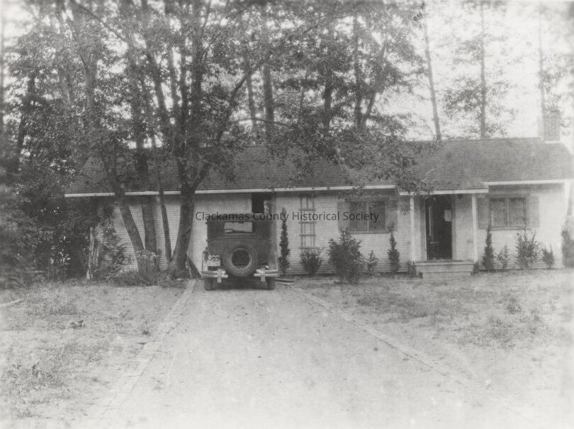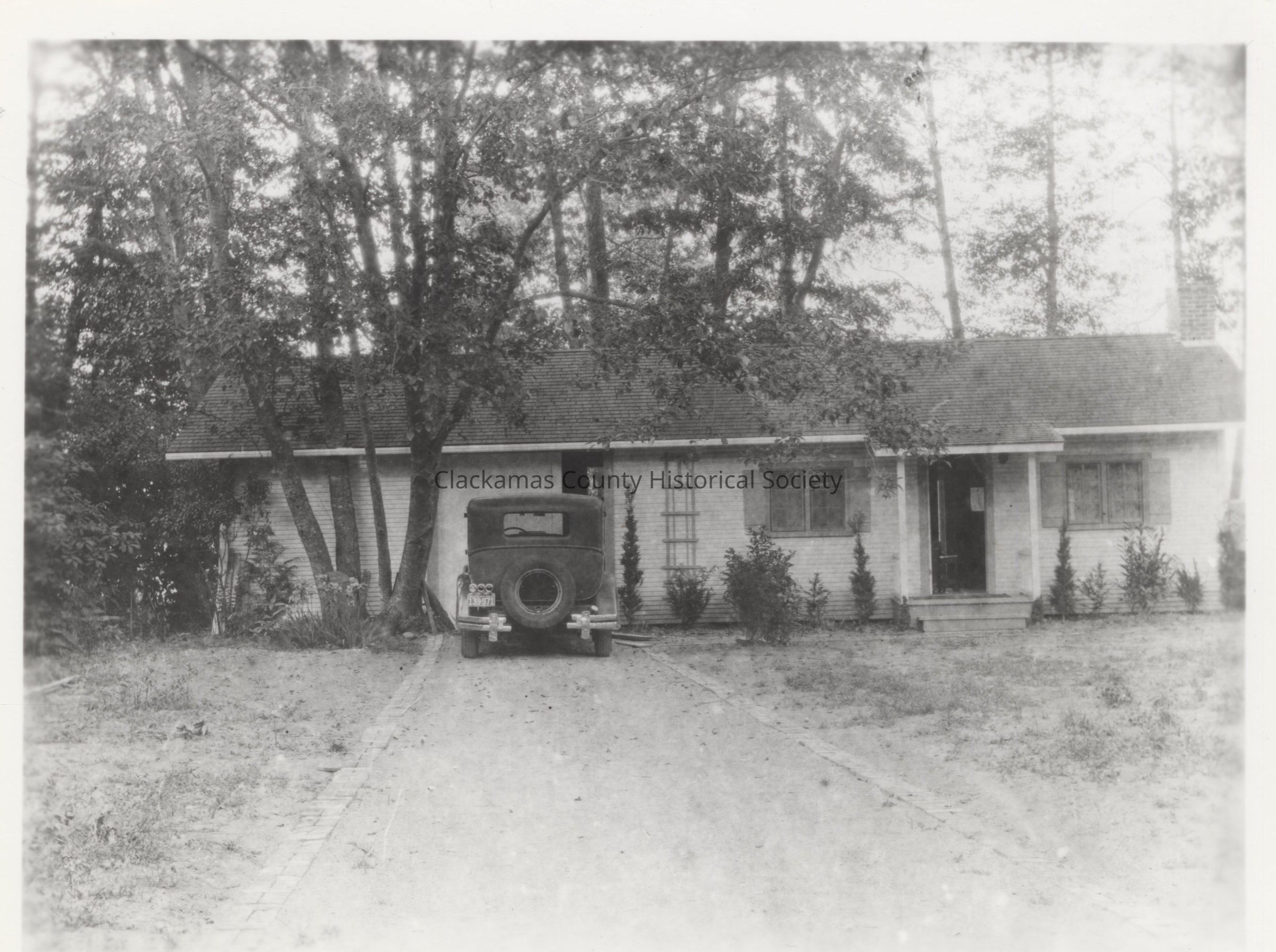 Mertie Steven's summer home. West Linn. Front of home, street side. An automobile is in the driveway. 1938Made/Created