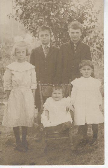 Left Frances Miller, Grace in chair, genevieve front right, Elmer on left Miller Samuel Miller Post card July 1914