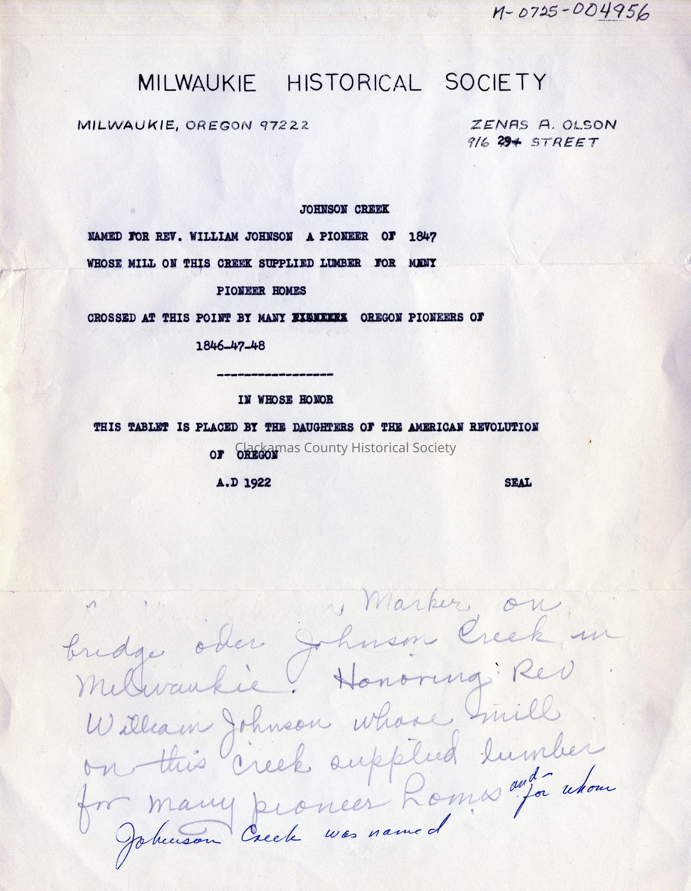 Dedication Marker on Bridge over Johnson Creek in Milwaukie, Oregon. Honoring Rev. William Johnson Whose mill on this creek supplied lumber for many Pioneer homes.