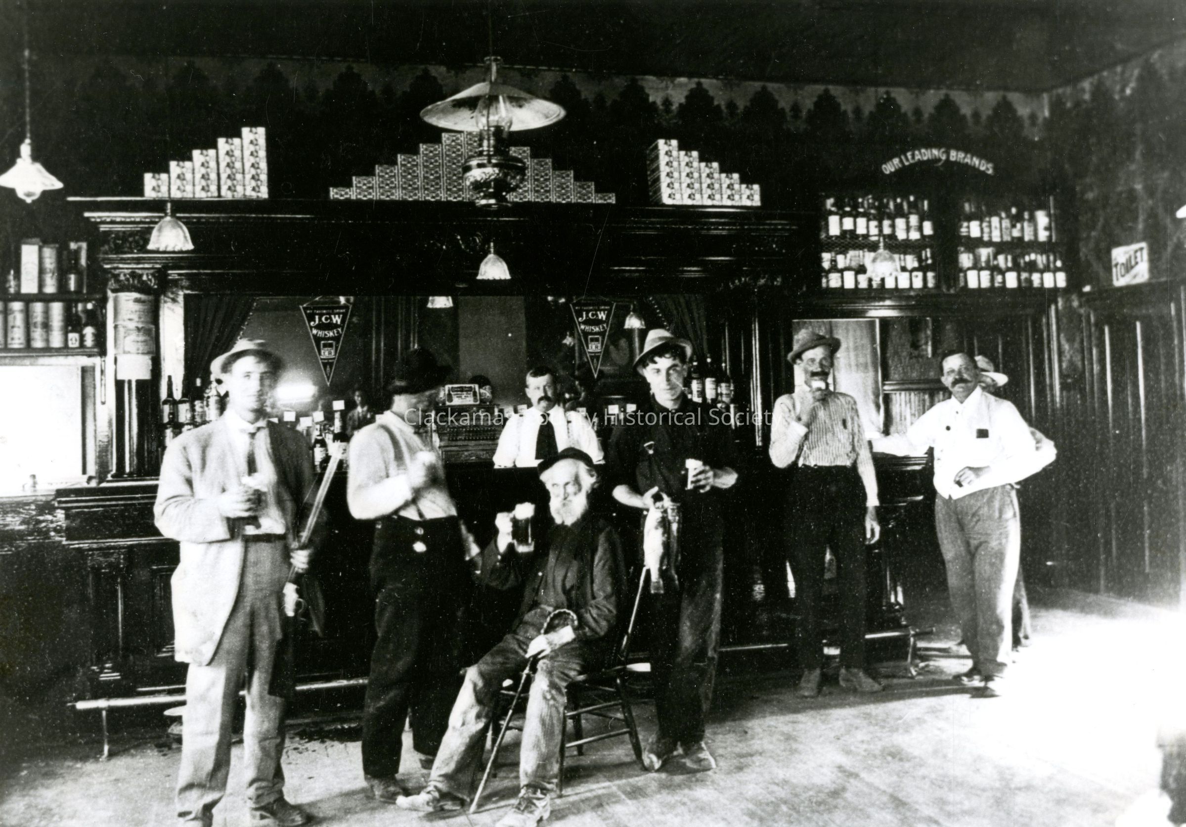 Milwaukie's Ullrich Saloon. Standing in front of the bar (L-R): 1) Don Luelling; 2) Bill James; 3) Jess Keck; 4) William Thompson. Seated: Noah Hubler.Made/Created