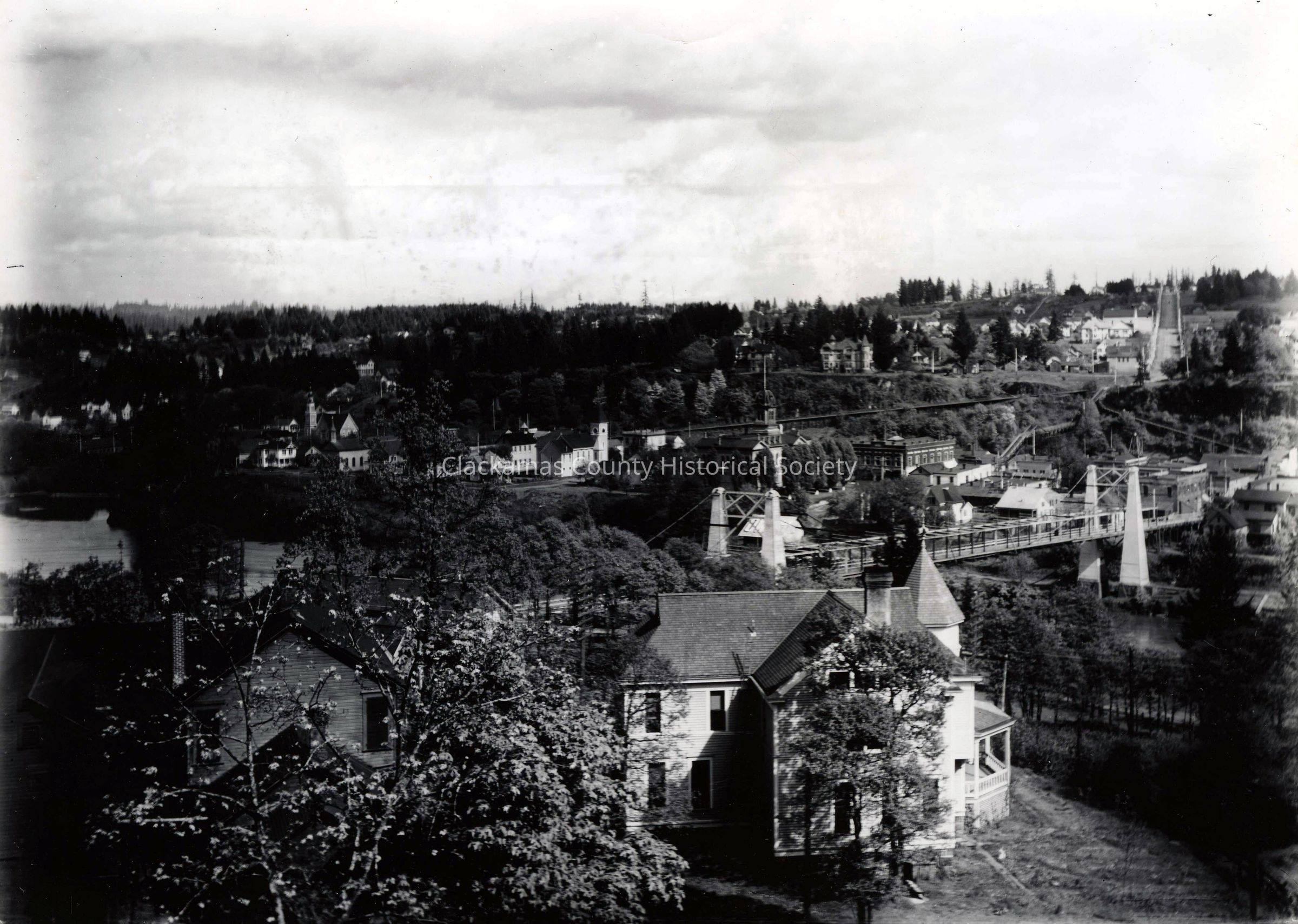 Moffatt Residence, Willamette Falls Drive, West Linn. The suspension bridge and Oregon City are in the background.Made/Created