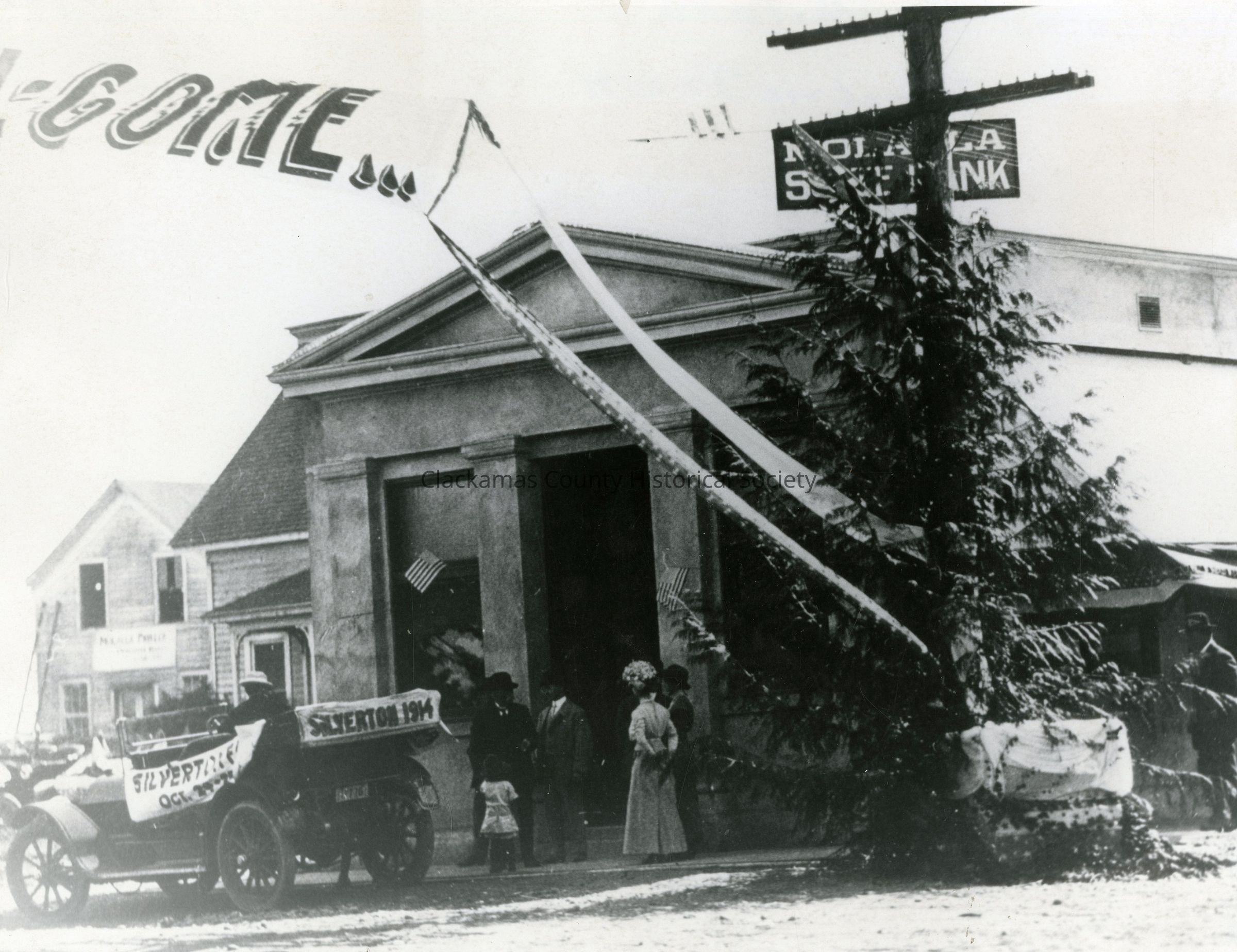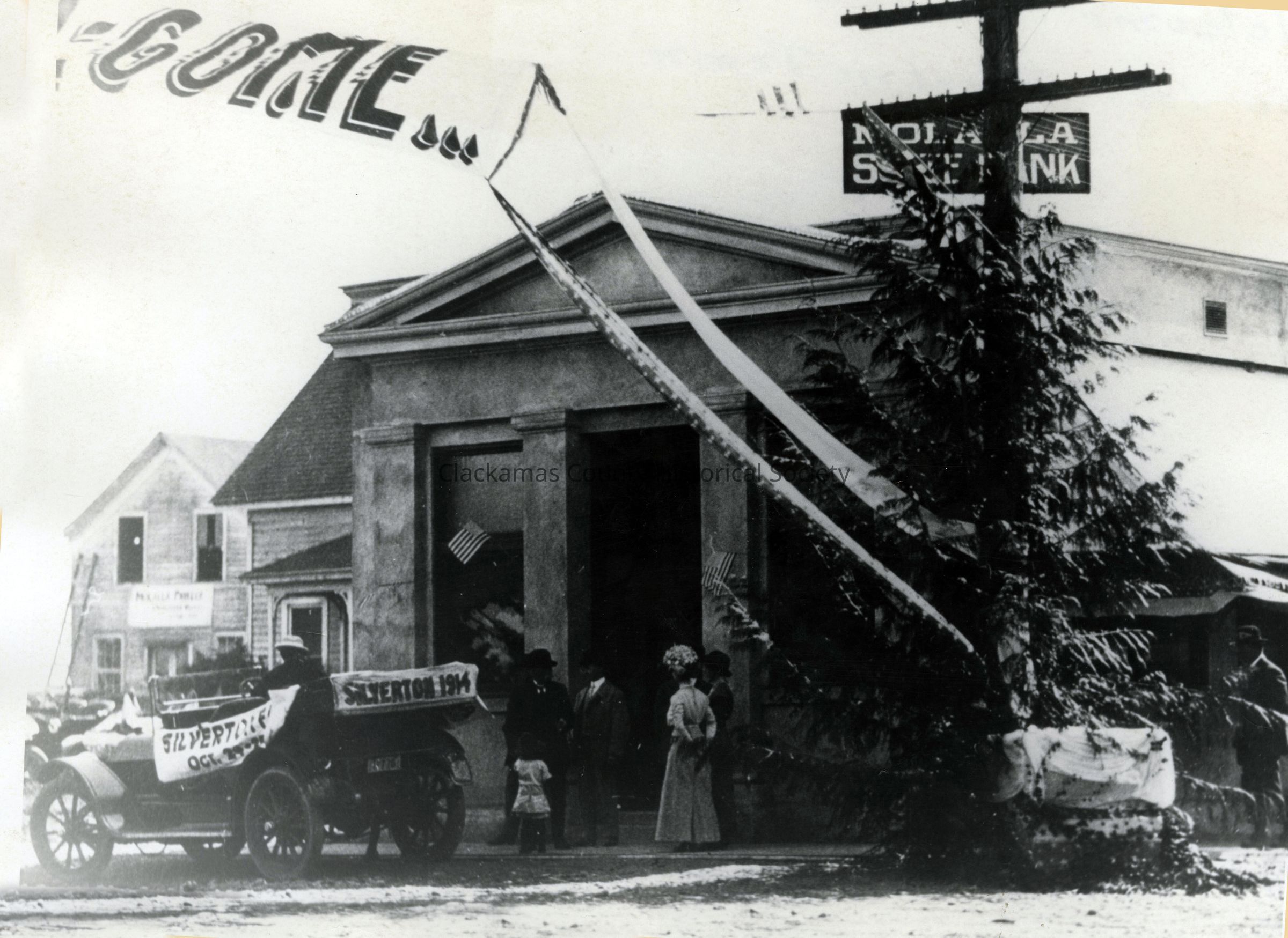 Welcome to Molalla and Its First Electric Train. Molalla State Bank in background.Made/Created
