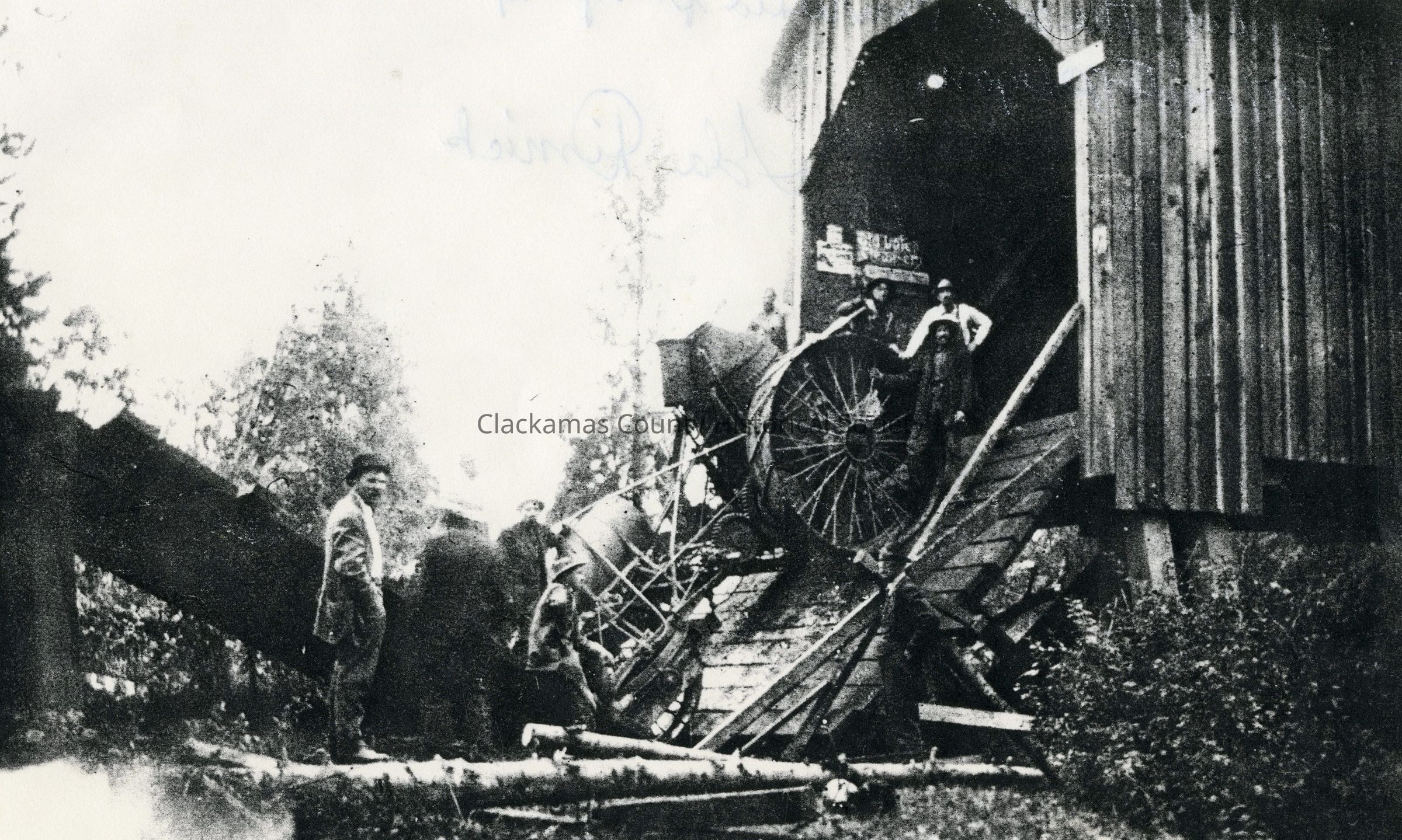 "Photocopy of Picture** Accident at Covered Bridge, Monitor, Oregon. A steam engine falls through the bridge decking during transport. The accident occurs on the east end of the covered bridge. The man with the steam engine is George Jenson.Made/Created