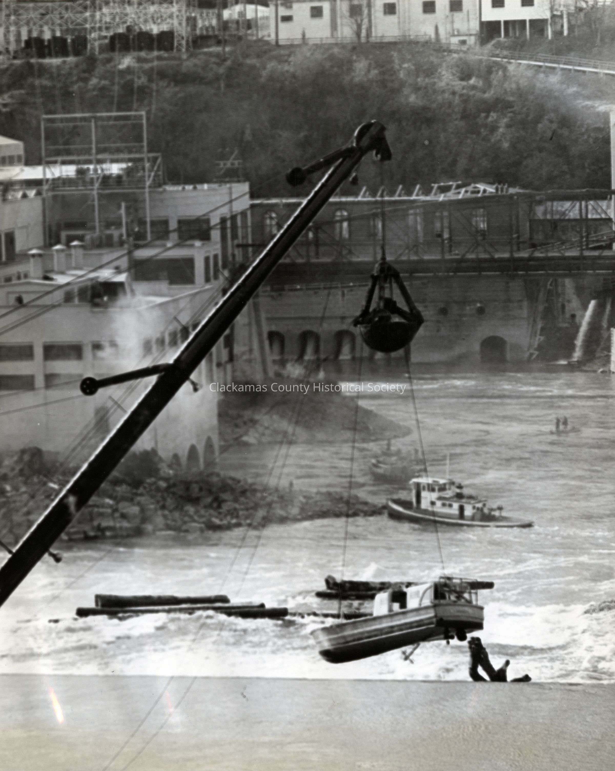 Sea Scout Boat SSS Chinook is lifted from from Rocks below Willamette River Falls in Oregon City, Oregon, to river above falls. Operation completed with no mishaps by the army engineers and Clyde Straight who boarded the boat to secure lines