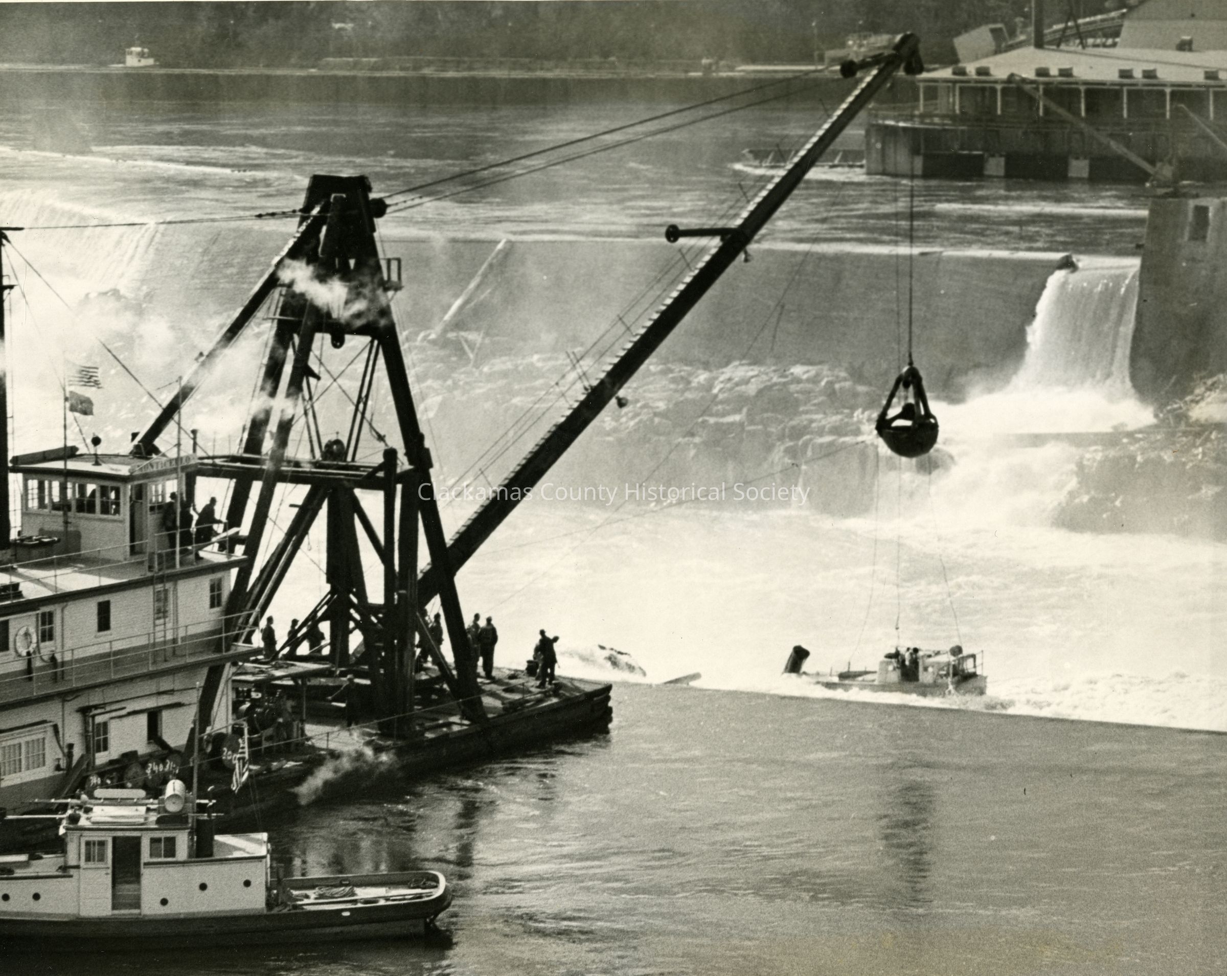 "Monticello" barge working on rescue of Sea Scout Boat "Chinook" - Willamette Falls - 1952Entry/Object ID