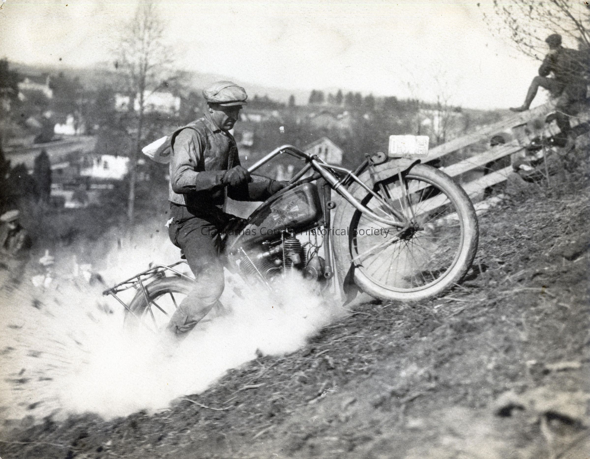 Motorcycle rider at Falls View, Oregon City. Early 1920s