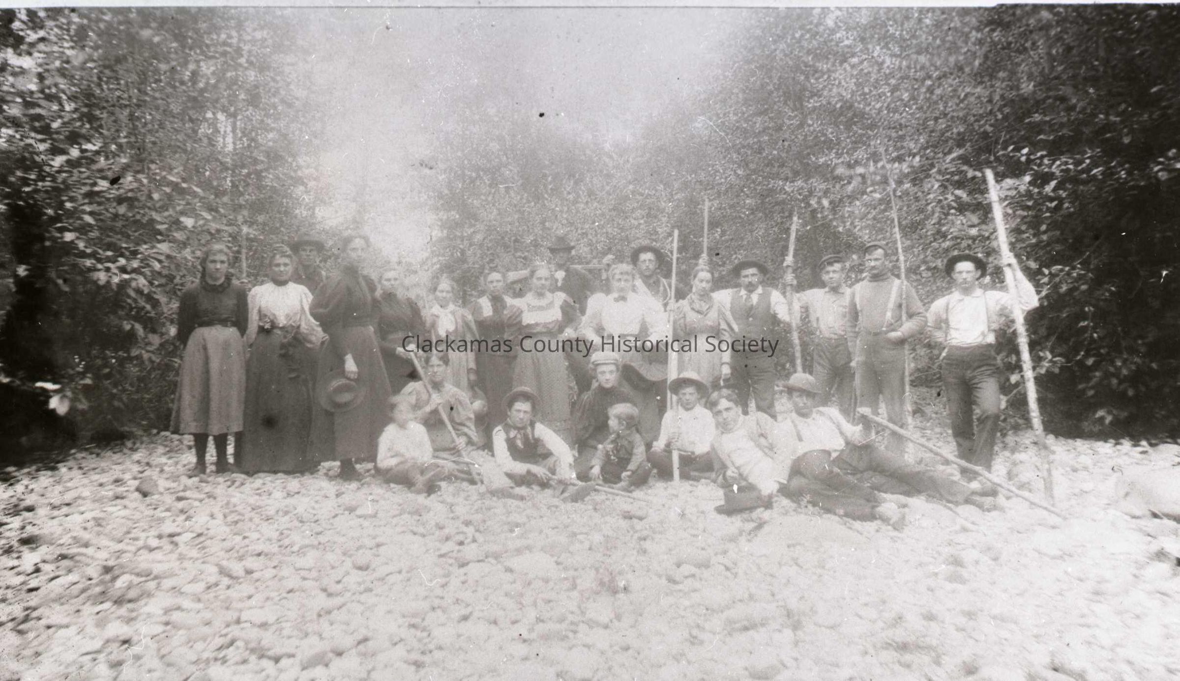 L-R: 1) Florence Barr; 2) Mrs. Meek; 3) Oliver Failing; 4) Edna Watkins; 5) Helen Failing; 6) Mrs. Kendall; 7) Mary Failing; 8) Comelia Failing; 9) Fred Peterson (with gun); 10) Mrs. Kern; 11) L. Kern; 12) Margery Bodley; 13) Bill Welch; 14) Will Palmer; 15) Lee Holden (former Portland Fire Chief); 16) Colton Meek (sitting); 17) ? ; 18) Jesse Bodley; 19) ? : 20) ? ; 21) ? ; 22) ? : 23) Stafford; and 24) Charley Nyd.Made/Created