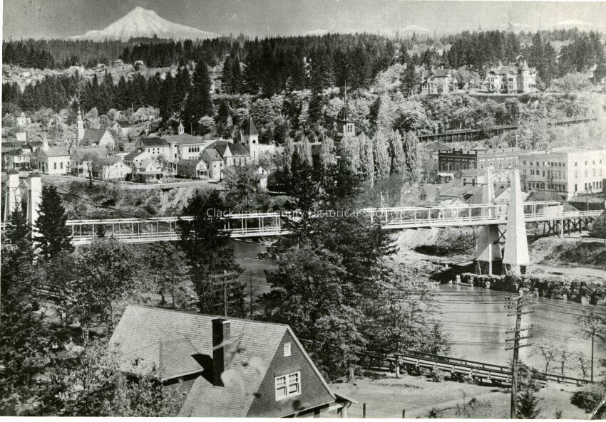 Mt. Hood over Oregon City. A 1900 Glass Plate negative was used, and Mt. Hood was inserted through a different negative.Made/Created